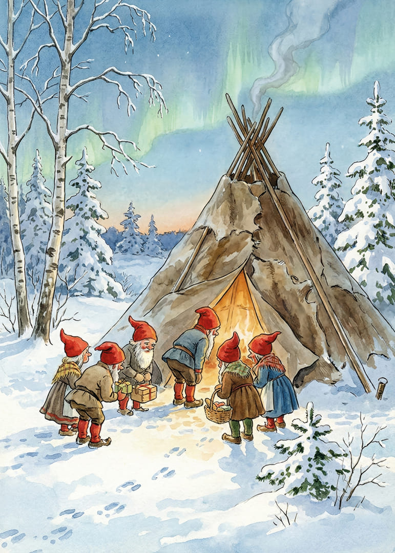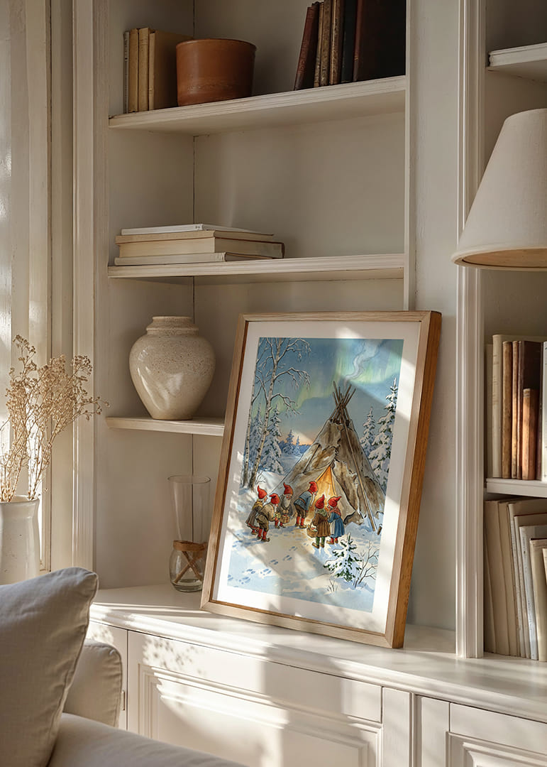 Denna poster fångar hjärtat av nordisk folklore med en grupp tomtar som samlas runt en varm eld vid en tältkåta i vinterskogen. Under det dansande norrskenet blir scenen levande med färger av vinter och mystik. Med sina glädjefyllda gester och vinterlandskapet som fond skapar postern en magisk atmosfär. Perfekt för att ge ditt hem en känsla av förtrollad nordisk vinternatt