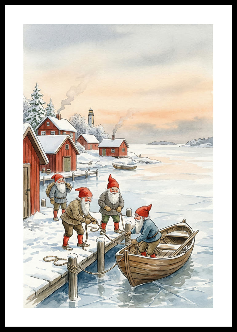 Fyra tomtar arbetar glatt på bryggan vid en frusen hamn. Med sina färgglada kläder och skäggiga leenden sprider de en magisk julstämning i det frostiga vinterljuset. De lilla båthusen och snöklädda träden i bakgrunden vittnar om en lugn nordisk kustby. Denna poster tar med dig till en tidlös plats fylld av värme och tradition, perfekt för att förgylla hemmets väggar med en doft av vinterns charm
