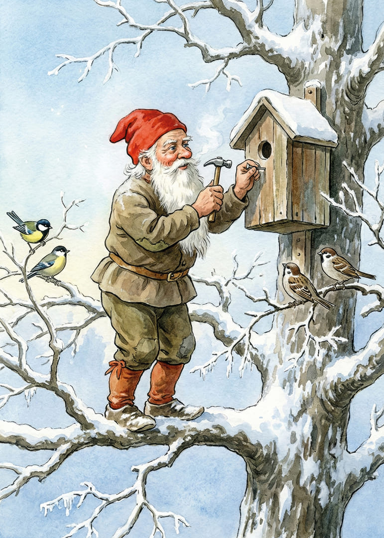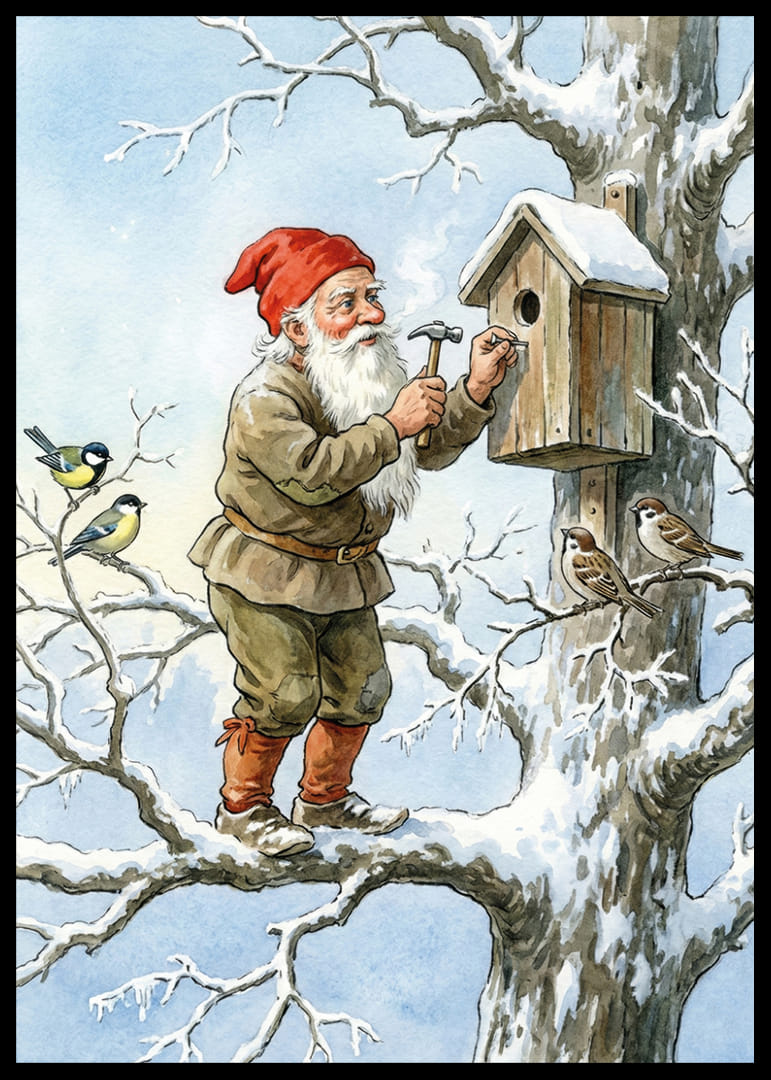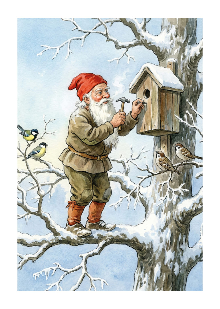 Denna poster fångar en magisk stund där en tomte flitigt arbetar på en fågelholk i ett snötäckt träd. Med sin röda mössa och stämningsfulla vinterscen sprider den en känsla av lugn och kreativitet. Den skira isen, som glittrar i ljuset, framhäver naturens skönhet. Postern fyller ditt hem med en harmonisk och fantasifull atmosfär, perfekt för att ge liv åt dina väggar