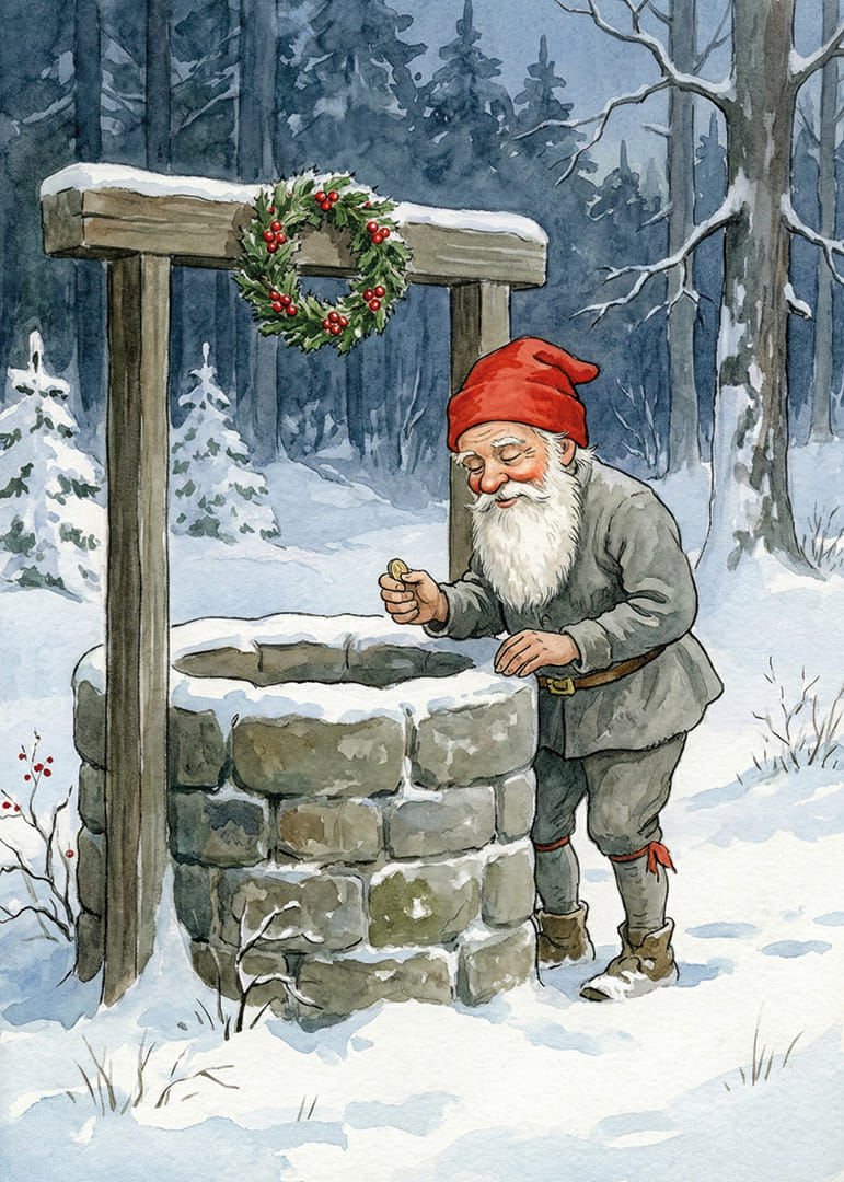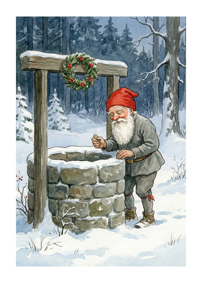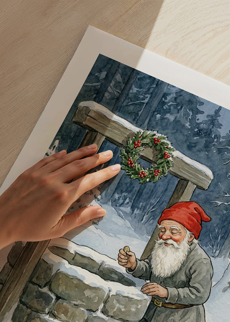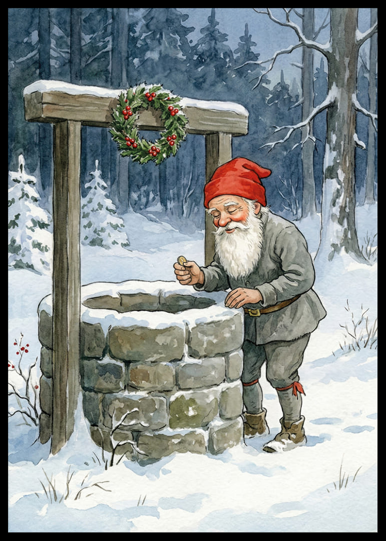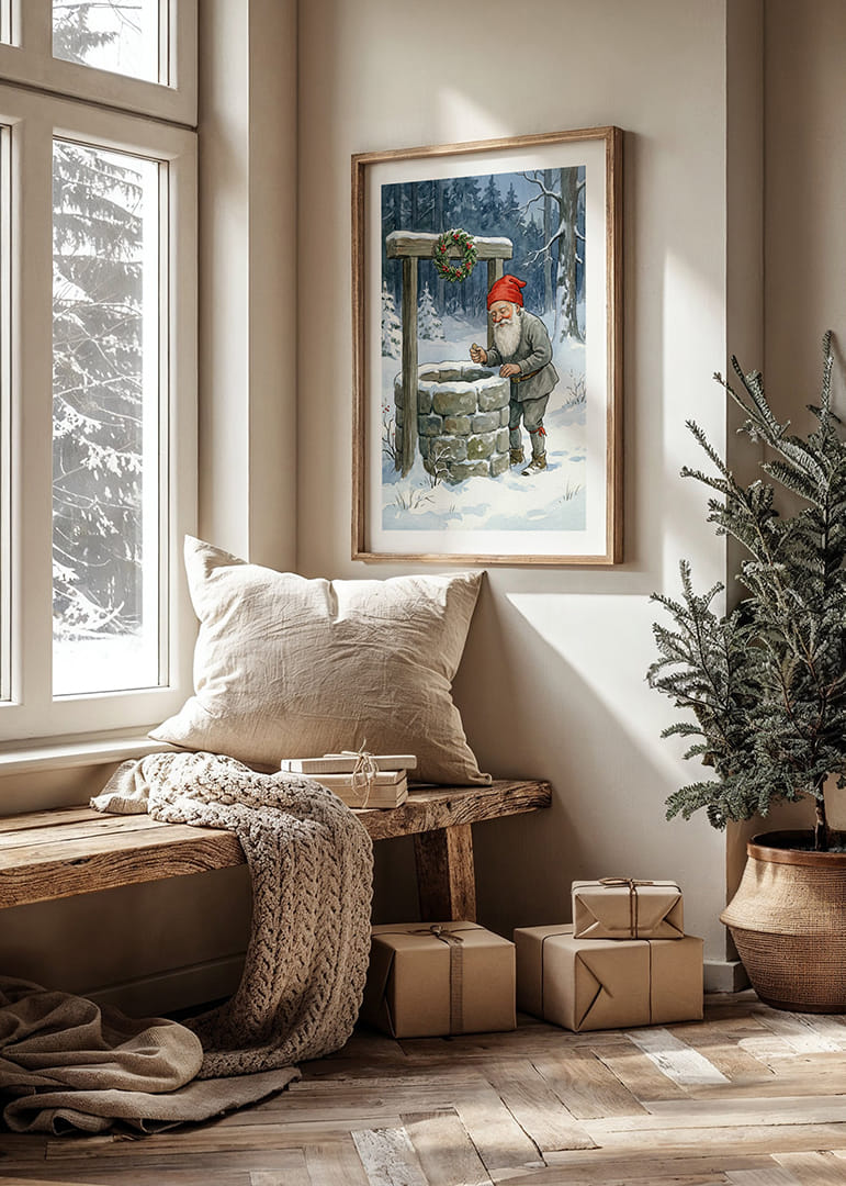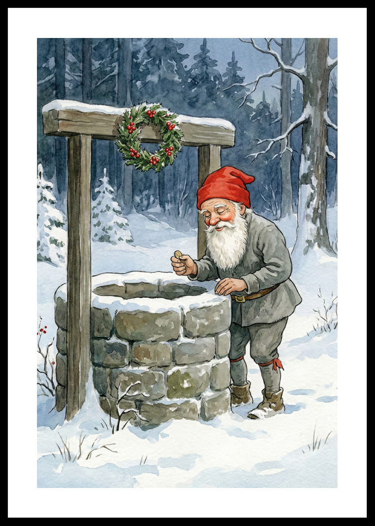 En gnistrande vintervärld fångar genast uppmärksamheten i denna förtrollande poster. Mitt i en snötäckt skog står en tomte vid en gammal stenbrunn, hans röda luva kontrasterar vackert mot den frostiga omgivningen. Den kransdekorerade brunnen bär på mystik och lockar till drömmar. Perfekt för att skapa en magisk och nostalgisk stämning i ditt hem under vintermånaderna