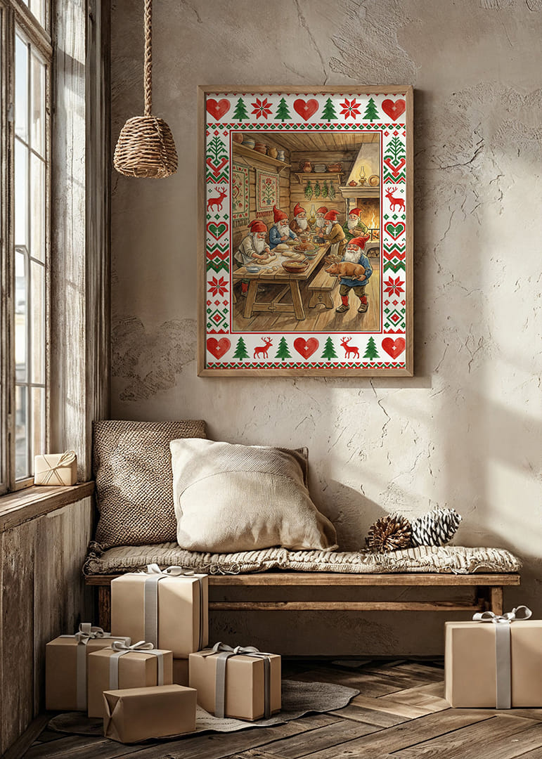 Denna poster fångar en förtrollande scen där tomtar samlas i en mysig stuga, omgivna av det varma ljuset från den öppna spisen. Med livliga färger och detaljer visar bilden dem medan de bakar och förbereder för högtiden. Affischens detaljer och stämning skapar en trygg och nostalgisk atmosfär, perfekt för att förgylla vintermånadernas inredning och ge hemmet en touch av sagolik charm