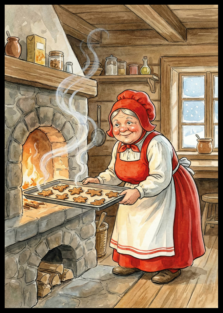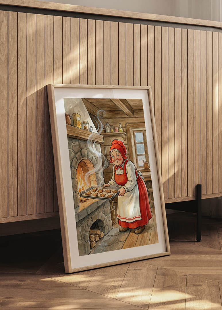 Denna poster fångar en härlig känsla av hemtrevnad när en äldre kvinna tar ut en plåt med pepparkakor från den öppna spisen. Hennes vänliga ansikte och den varma elden skapar en inbjudande och nostalgisk stämning. Färgerna och detaljerna ger liv åt scenen och för tankarna till tidlös julmagi. Denna poster förhöjer mysfaktorn i ditt hem och skapar en varm atmosfär