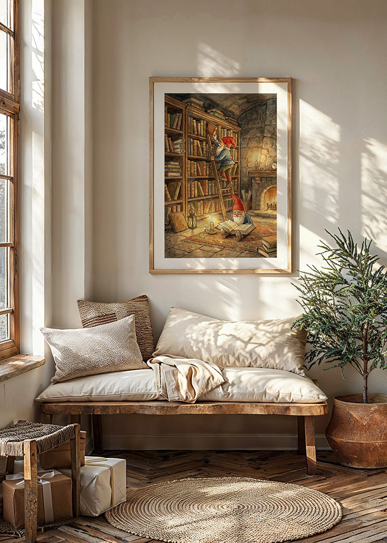I denna poster finner vi två tomtar fördjupade i böckernas värld, omgivna av en varm och inbjudande atmosfär. Ljuset från levande ljus och en sprakande brasa kastar mjuka skuggor över stenmurarna. Den ena tomten står på stegen medan den andra sitter bekvämt på golvet och läser. Denna poster förvandlar vilket rum som helst till en plats för magiska äventyr och litterär njutning