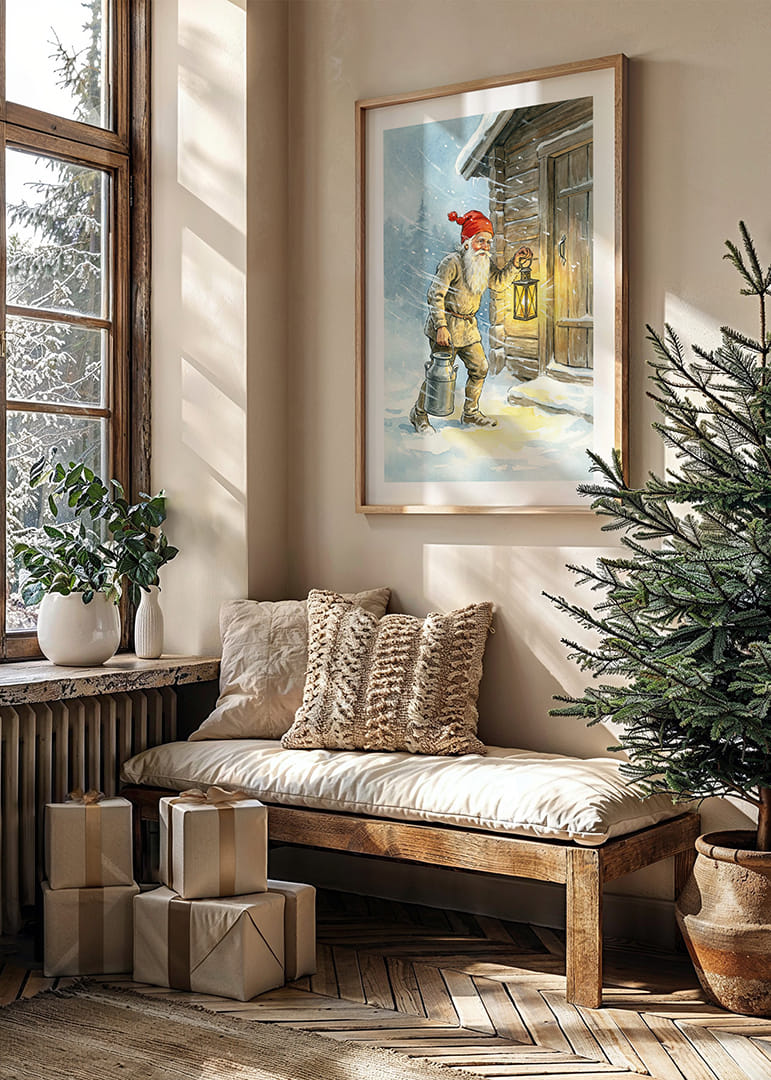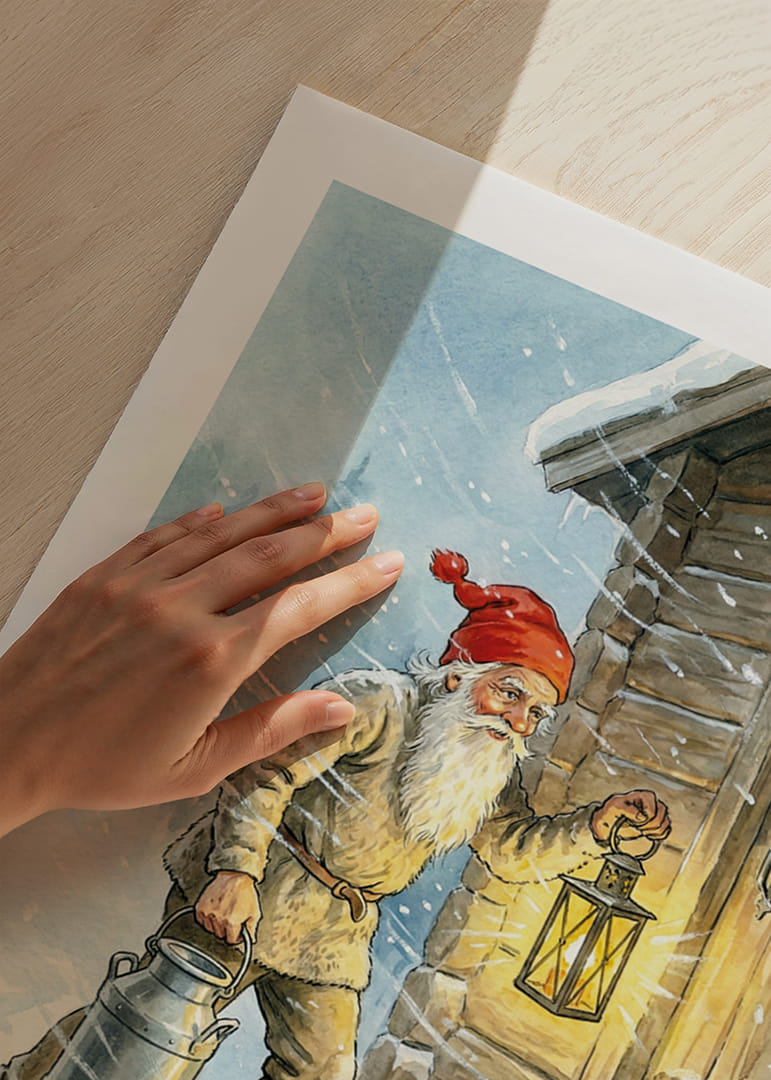 Denna poster fångar en magisk vinterstund med en tomte som lyser upp natten med sin lykta. Snön faller tyst omkring honom när han bär en gammaldags mjölkhink, och hans röda mössa lyser färgglatt mot den frostiga bakgrunden. Mötet mellan ljus och mörker skapar en varm stämning, perfekt för att göra ett rum mer inbjudande och fyllt av säsongens charm. En poster som verkligen förhöjer atmosfären