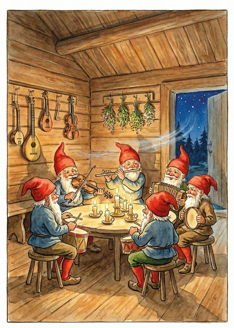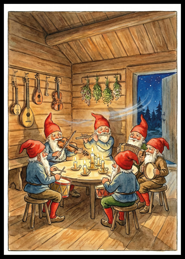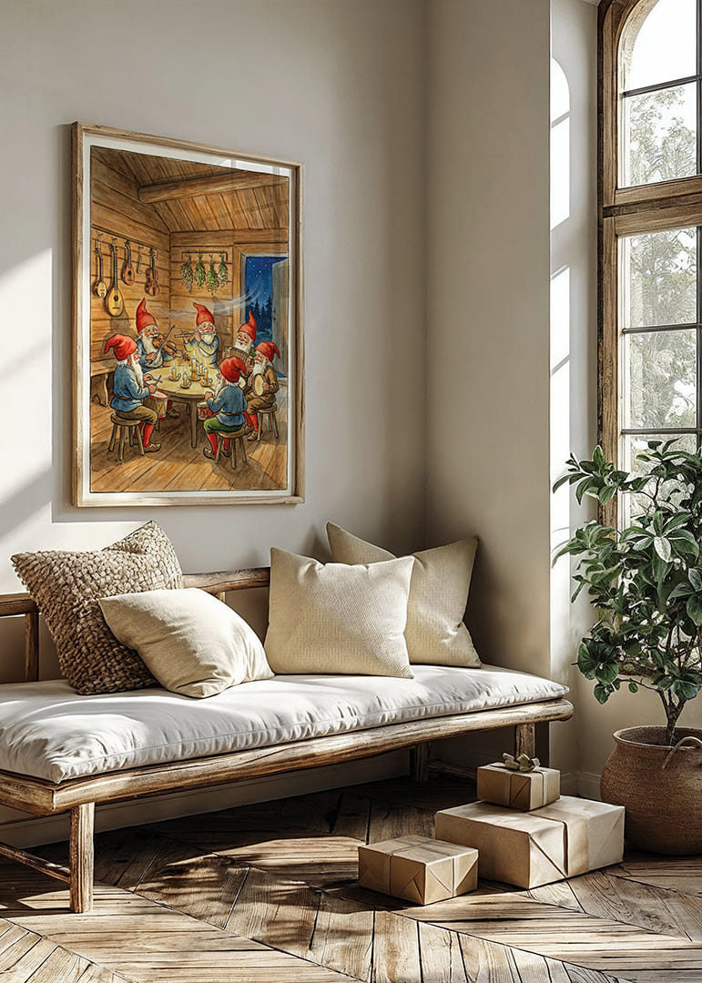 Denna poster fångar en förtrollande scen där en grupp tomtar spelar musik i en trädstuga, omgiven av instrument och levande ljus. Stjärnorna lyser genom den öppna dörren, vilket skapar en magisk atmosfär av gemenskap och harmoni. Med sina varma färger och levande detaljer kan denna poster förvandla vilket vardagsrum som helst till en plats full av berättelser och drömmar