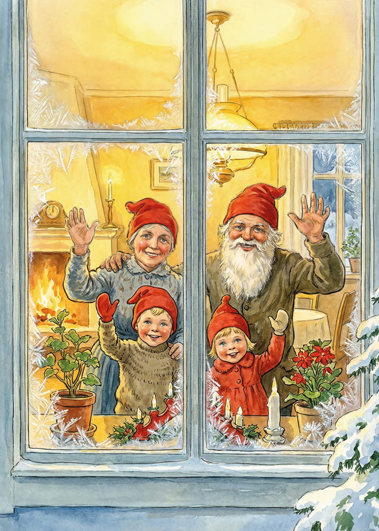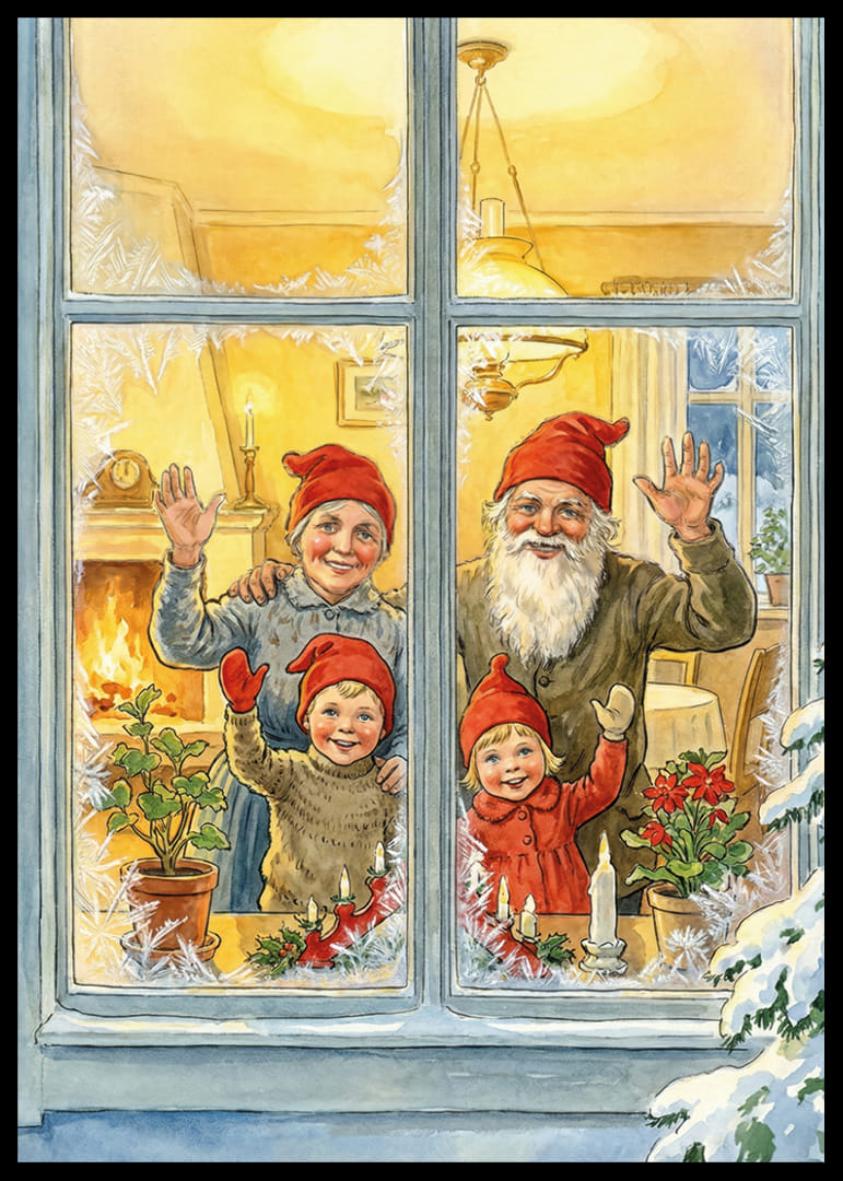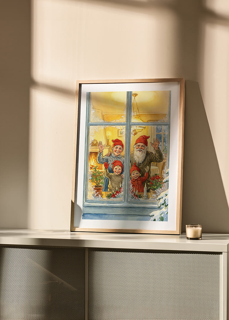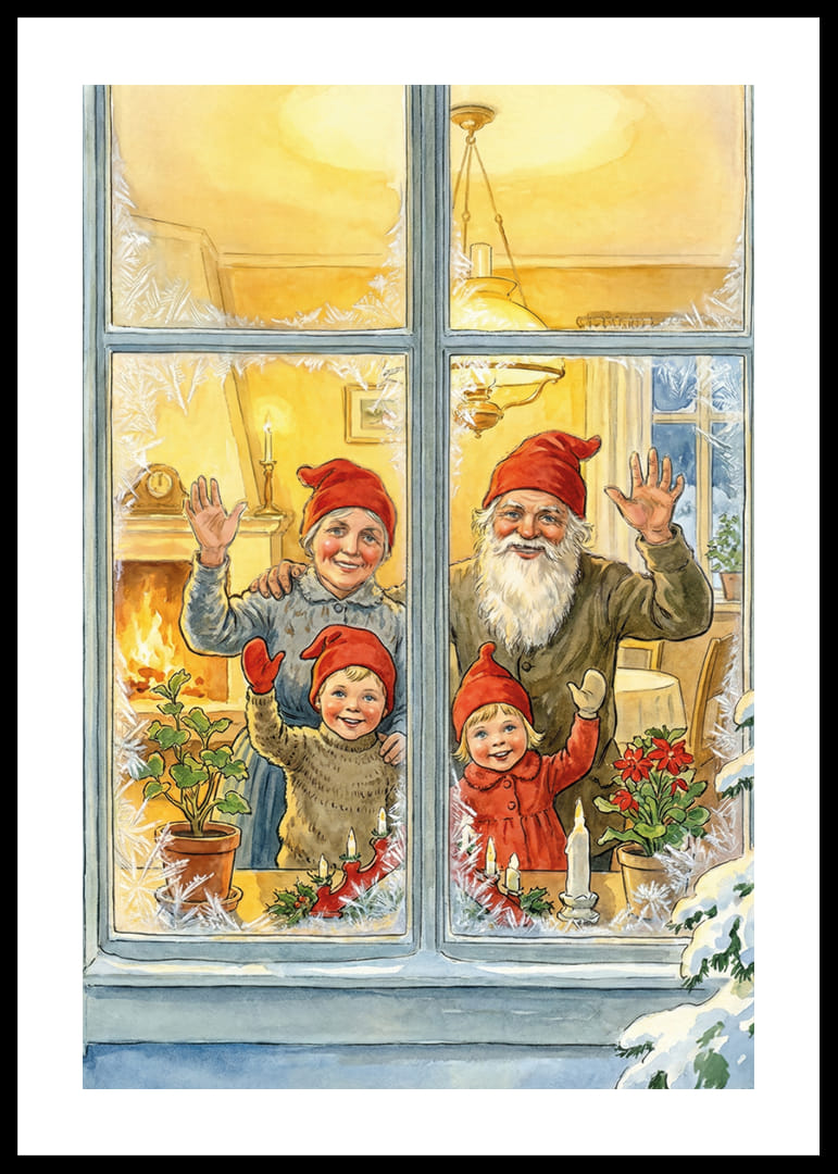 I denna förtrollande poster sprider en familj glädje och värme bakom frostiga rutor, iklädda röda tomteluvor. Ljuset från eld och ljusstakar skapar en mysig atmosfär som kontrasterar mot det kalla vinterlandskapet utanför. Deras leenden och vinkande händer bjuder in till gemenskap. Denna poster förvandlar vilket rum som helst till en varm och inbjudande plats under den kalla årstiden