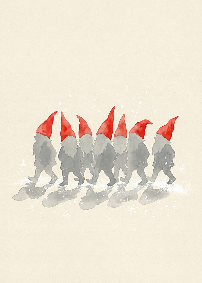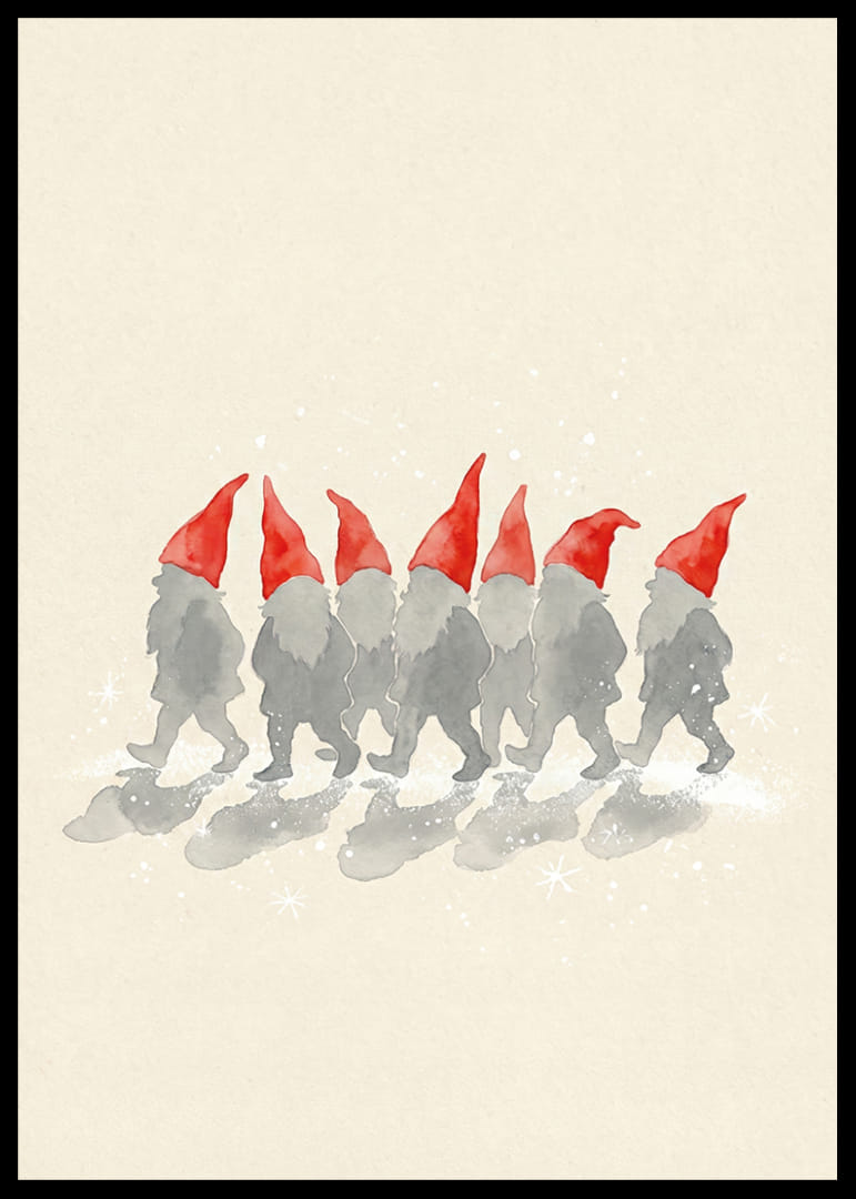 Denna poster fångar en grupp charmiga tomtar som marscherar i tystnad, med sina ikoniska röda hattar som skapar en stark kontrast mot en mjuk bakgrund. De små figurerna väcker en känsla av nostalgi och fantasi, och skapar ett lekfullt och mysigt inslag i ditt hem. Perfekt för att bringa liv och glädje till en vardagsrumsvägg, och ger varje rum en känsla av sagans magi
