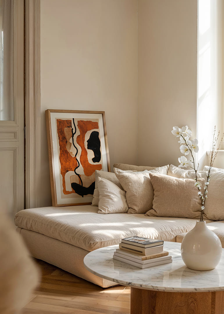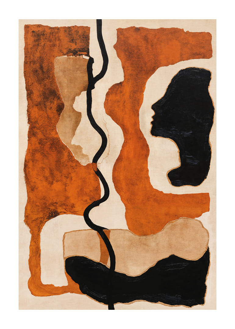 Denna poster fångar ögat med sina djupa jordtoner och organiska former som böjer sig över duken. Kontrasternas spel mellan svart och rost skapar ett dynamiskt flöde, som tillsammans med den svepande linjen ger en känsla av rörelse och sammanhang. Med sin abstrakta natur och harmoniska färgskala förvandlar postern ditt hem till en plats för eftertanke och estetik, och ger utrymmet en djup känsla av konstnärlig närvaro.