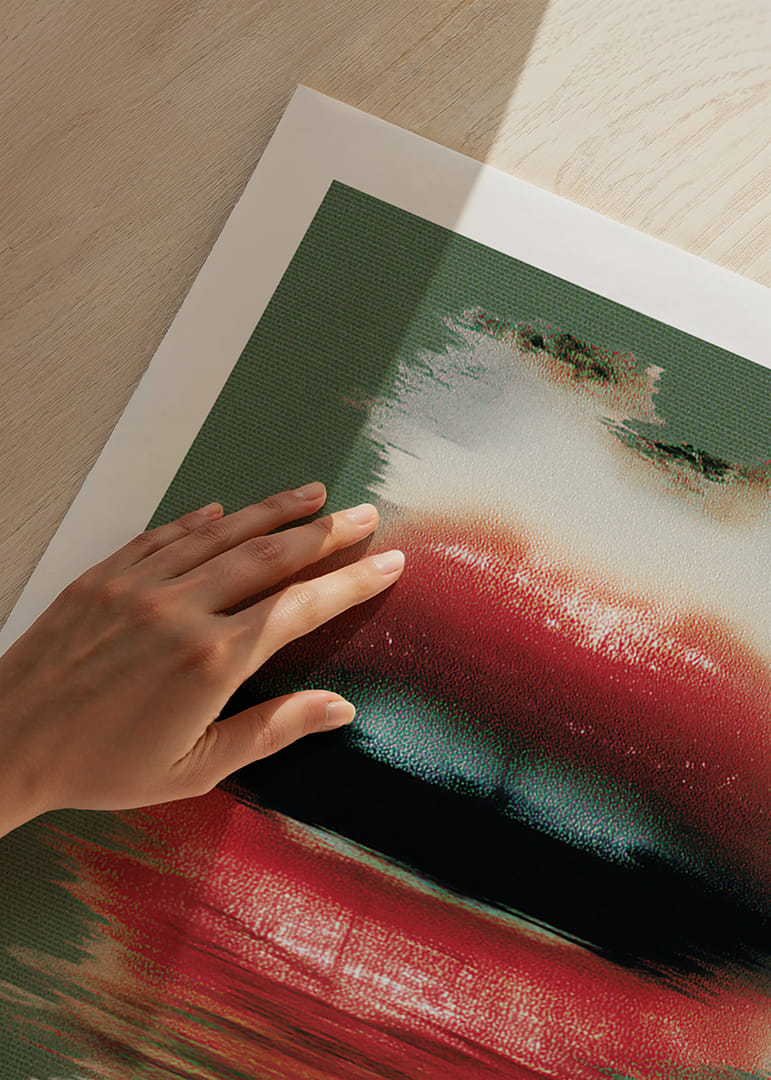Denna poster fängslar med sina intensiva röda läppar mot en djupgrön bakgrund, vilket skapar en omedelbar dramatisk effekt. De glansiga läpparna, vagt speglade nedåt, ger en känsla av mystisk lockelse och modern konst. Perfekt som en central del i ett vardagsrum, förändrar denna poster genast stämningen med sin djärva och färgstarka närvaro och gör rummet till en konversationspunkt.
