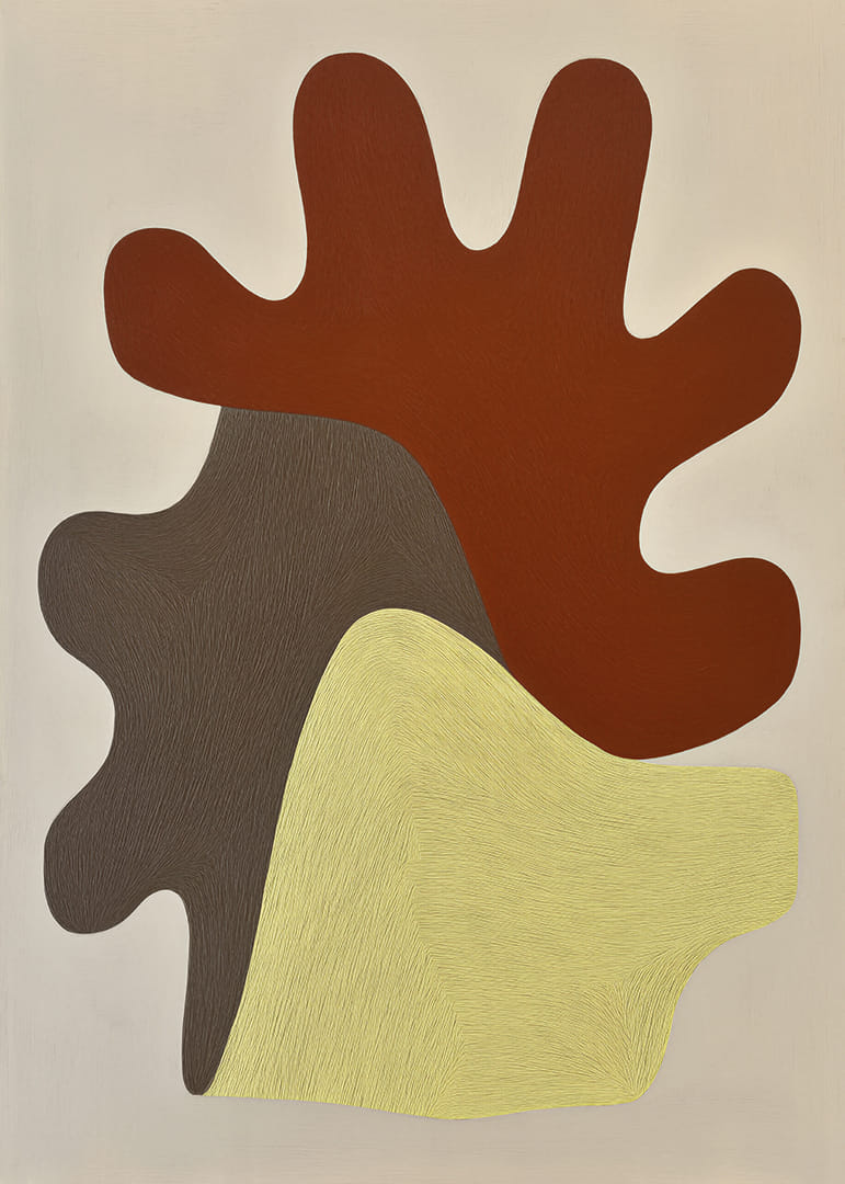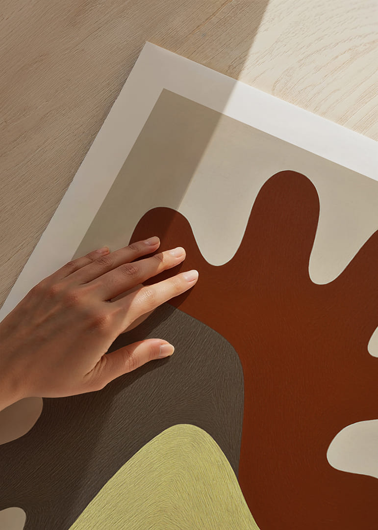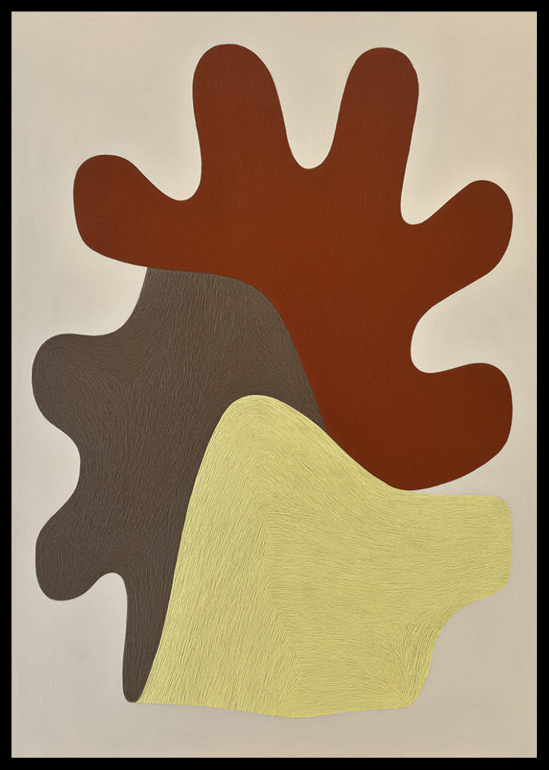 Denna poster utstrålar lugn med sina mjuka, harmoniska former och jordiga färger. En djup bordeauxnyans smälter samman med stilfull mossgrön och varm chokladbrun för att skapa en känsla av naturens omfamning. Postern ger rummet en känsla av balans och harmoni, perfekt för att skapa en avkopplande och naturlig atmosfär. Den är idealisk för att förstärka hemtrevnaden i vilket utrymme som helst.