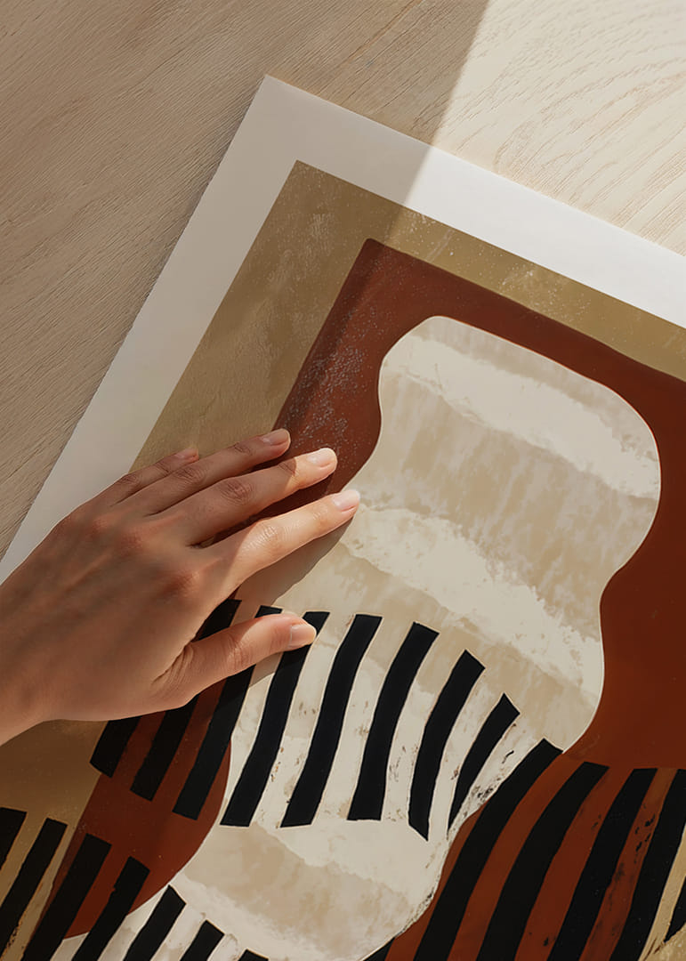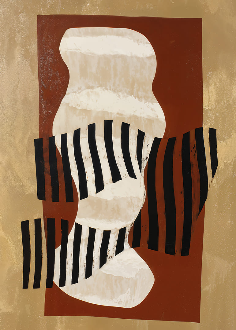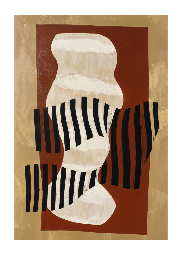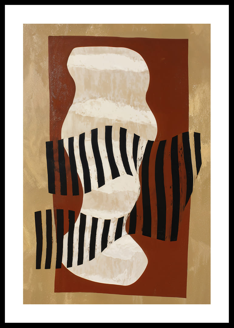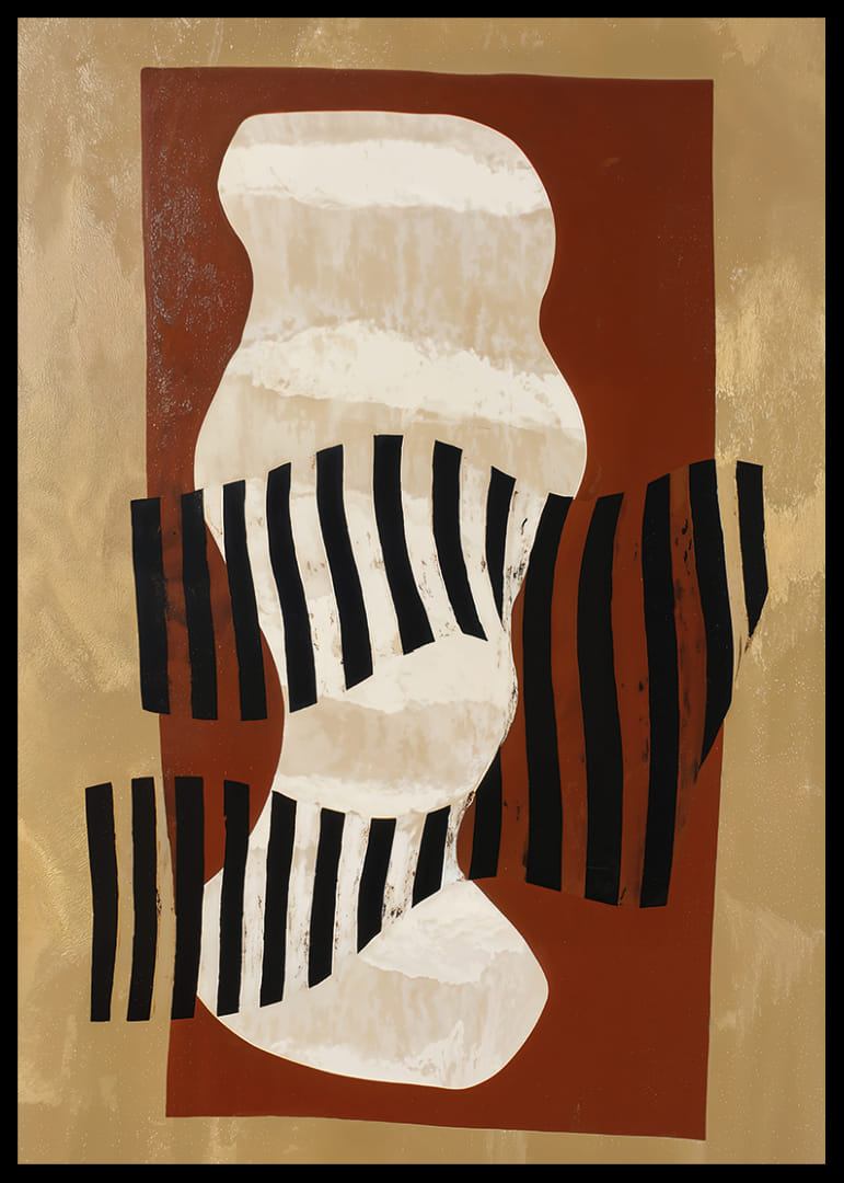 Utforska den dynamiska energin hos denna poster där mjuka, organiska former möter djärva, geometriska linjer. Detta konstverk skapar en fascinerande lek av ljus och skugga som drar blicken och öppnar sinnena. Med sina djupa färger och rytmiska mönster ger postern en sofistikerad dimension till vilket rum den än pryder, vilket skapar en atmosfär av modern elegans och stil.