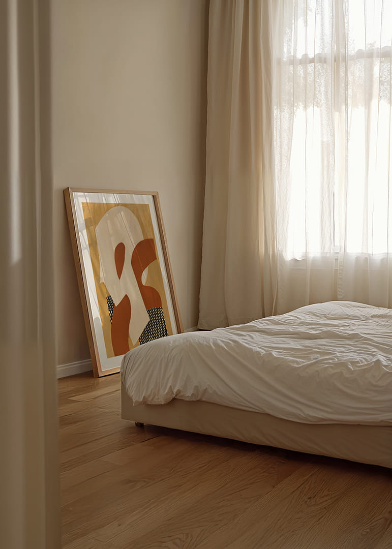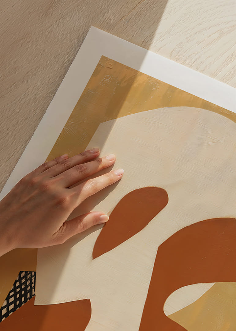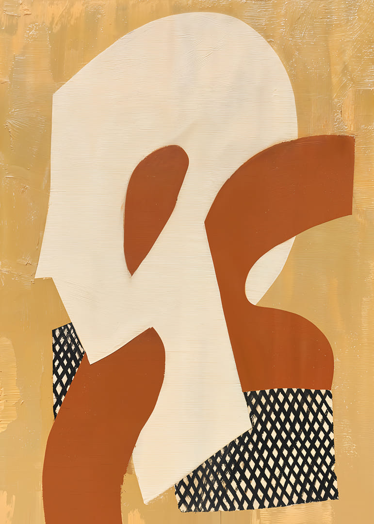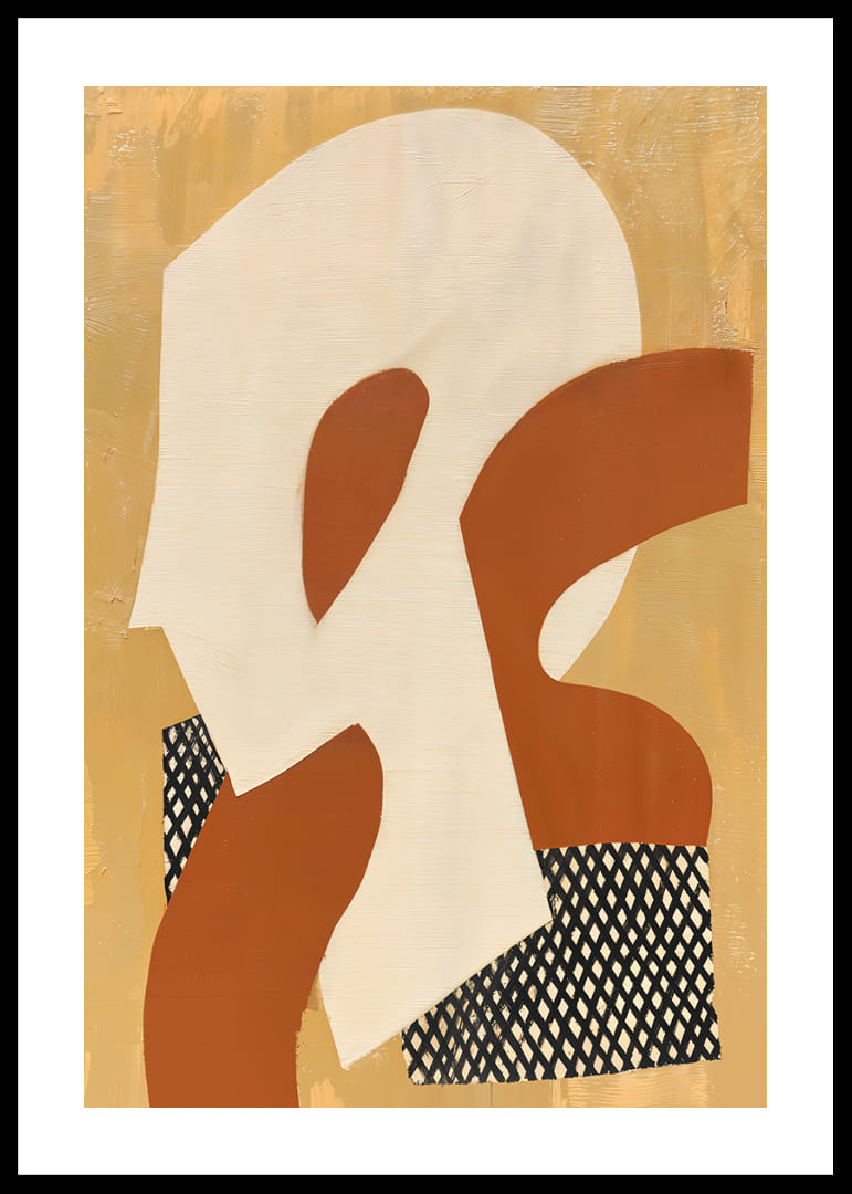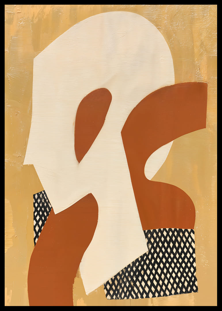 Denna poster fångar blicken med sina organiska former i varma gyllene och rostiga toner. Det geometriska mönstret bryter på ett elegant sätt av de mjuka färgerna och skapar en lyxig känsla av djup och rörelse. Dessa element samspelar för att förvandla vilket rum som helst till en oas av kreativitet och lugn. Posterns harmoniska design skapar en subtil men stark närvaro i hemmet.