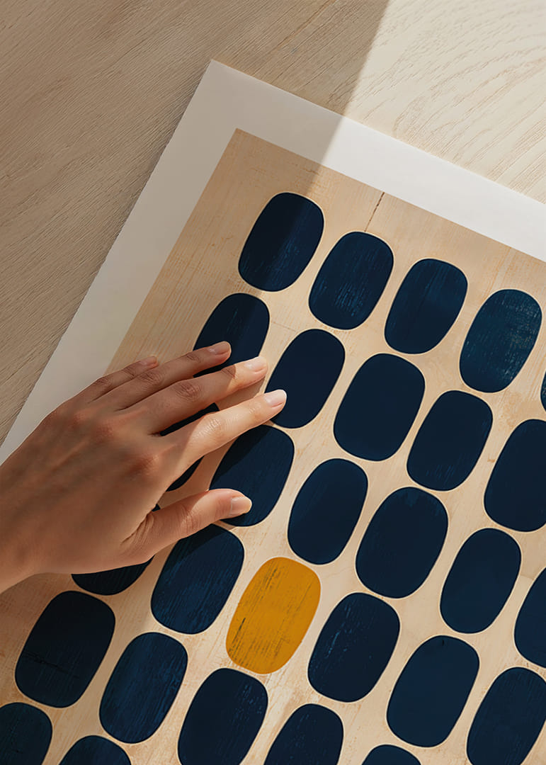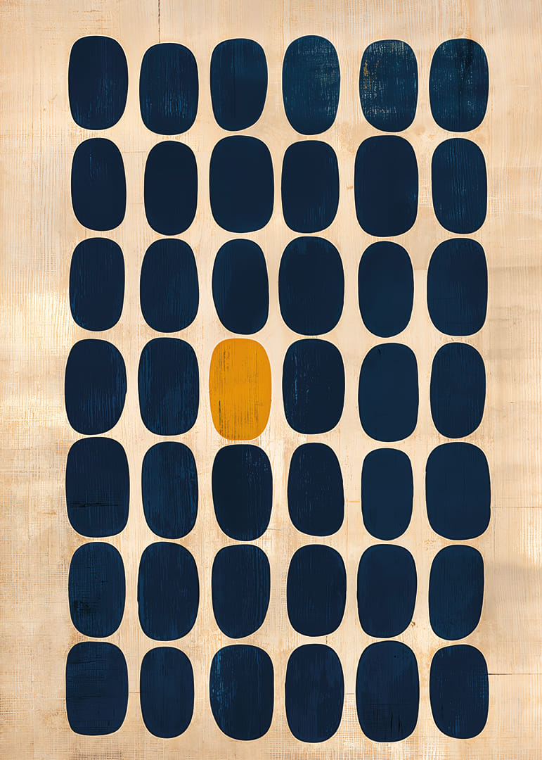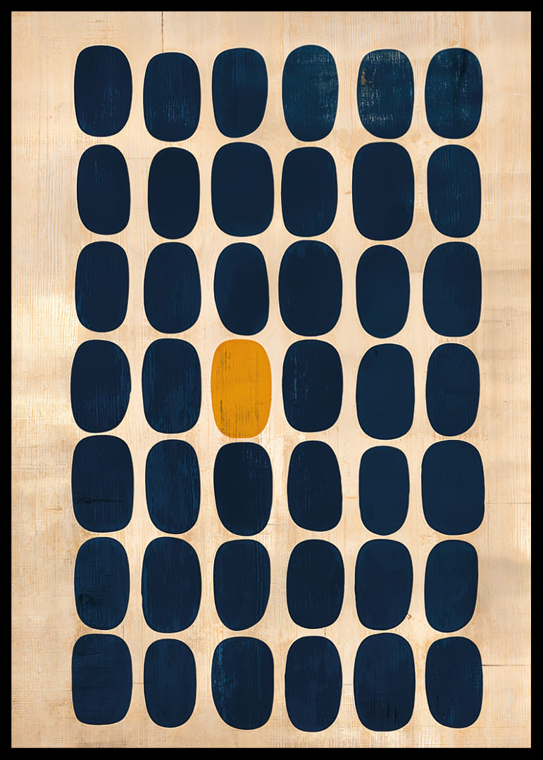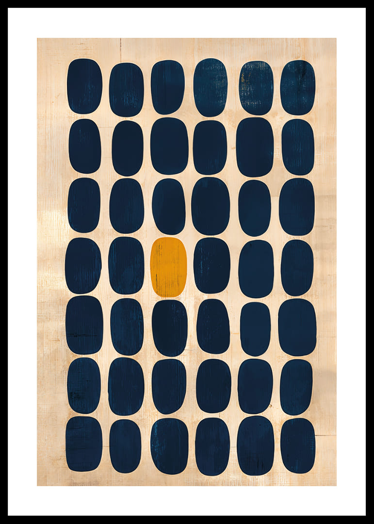En affisch med djärva blå rektanglar som elegant kontrasterar mot en varm gyllene bakgrund. Den enda gyllene rektangeln bryter mönstret och skapar en mystisk och harmonisk balans. De mjuka formerna och färgkombinationerna ger rummet en modern och sofistikerad atmosfär. Denna affisch är perfekt för att ge liv åt en vägg och skapa en elegant men ändå lugn känsla i vilket rum som helst.