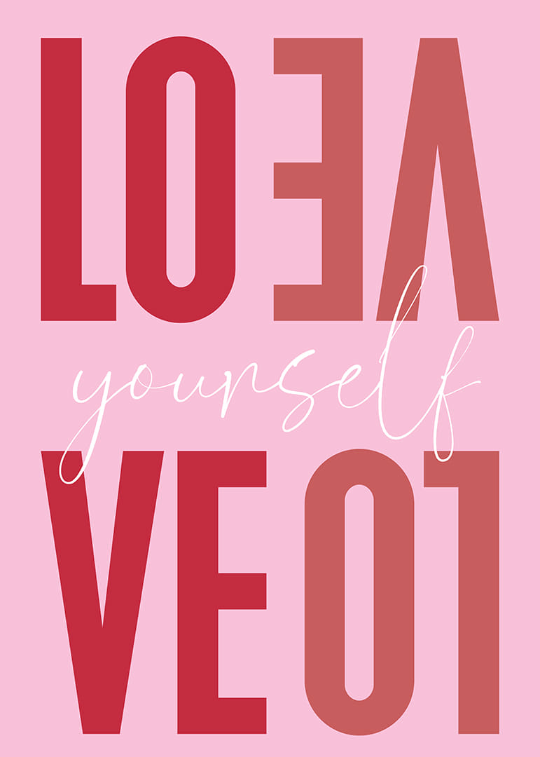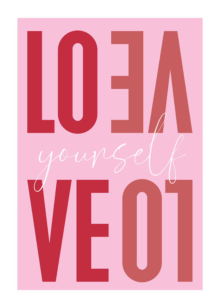 Med djärva bokstäver och en rosa bakgrund bär denna poster ett kraftfullt budskap om självkärlek och att omfamna sig själv. Orden står ut i en varm nyans som framhäver varje detalj och kontrasterar snyggt mot det mjuka rosa. Denna poster blir en perfekt daglig påminnelse på väggen om att vårda och älska sig själv, och skapar samtidigt en inbjudande och positiv atmosfär i varje rum.
