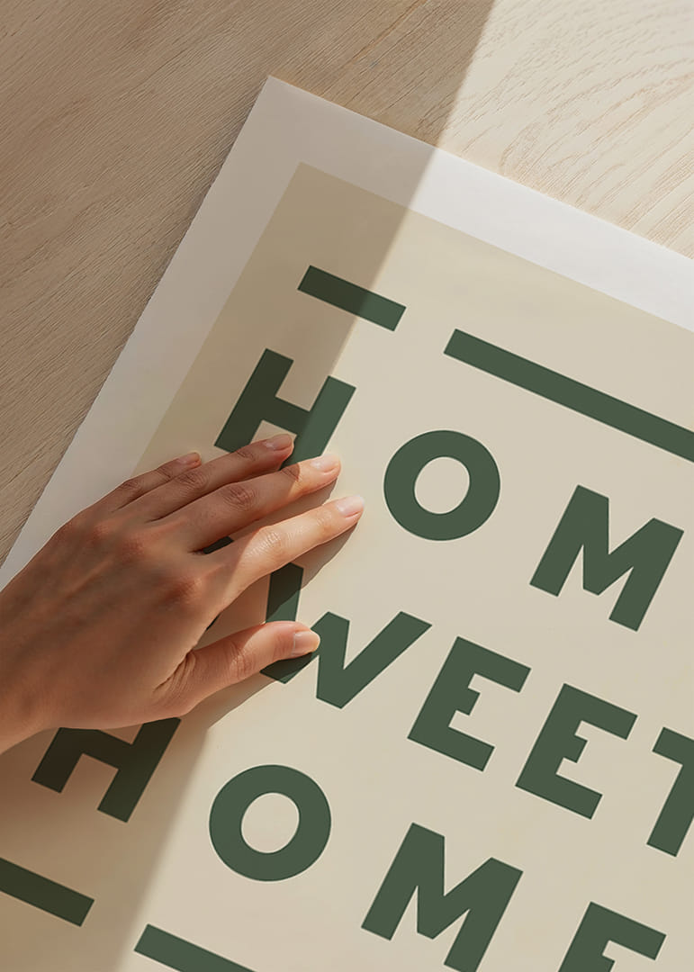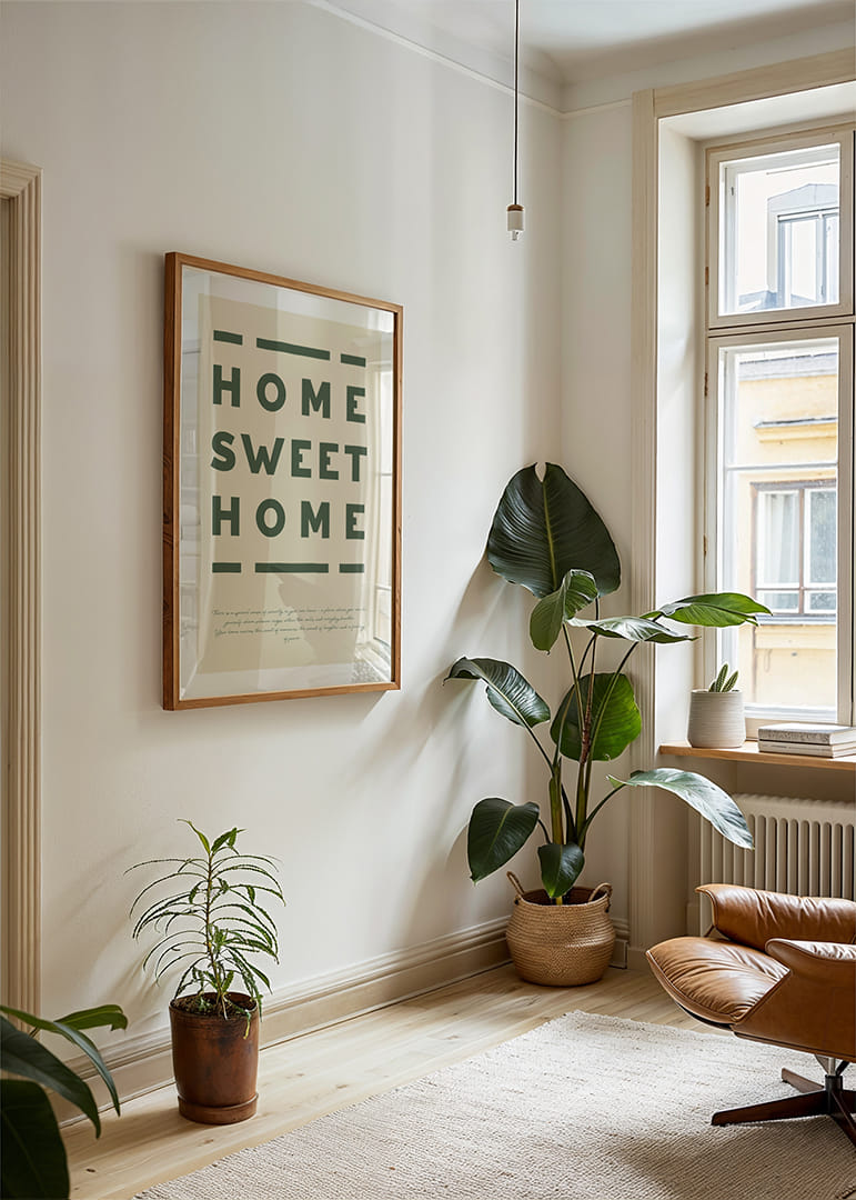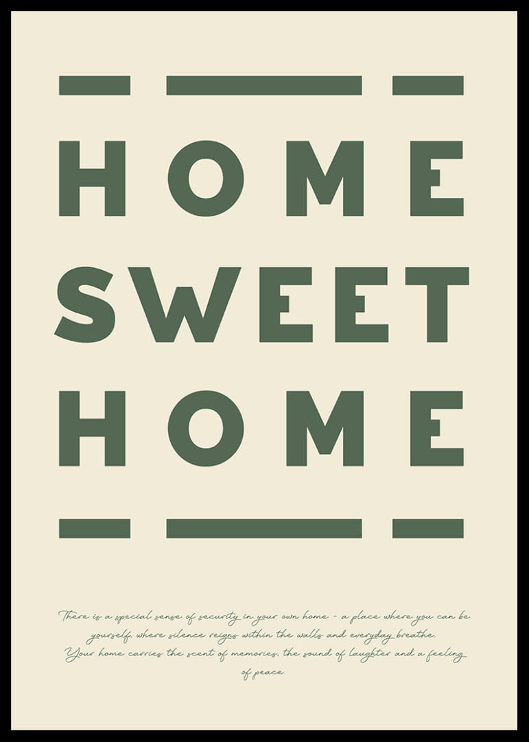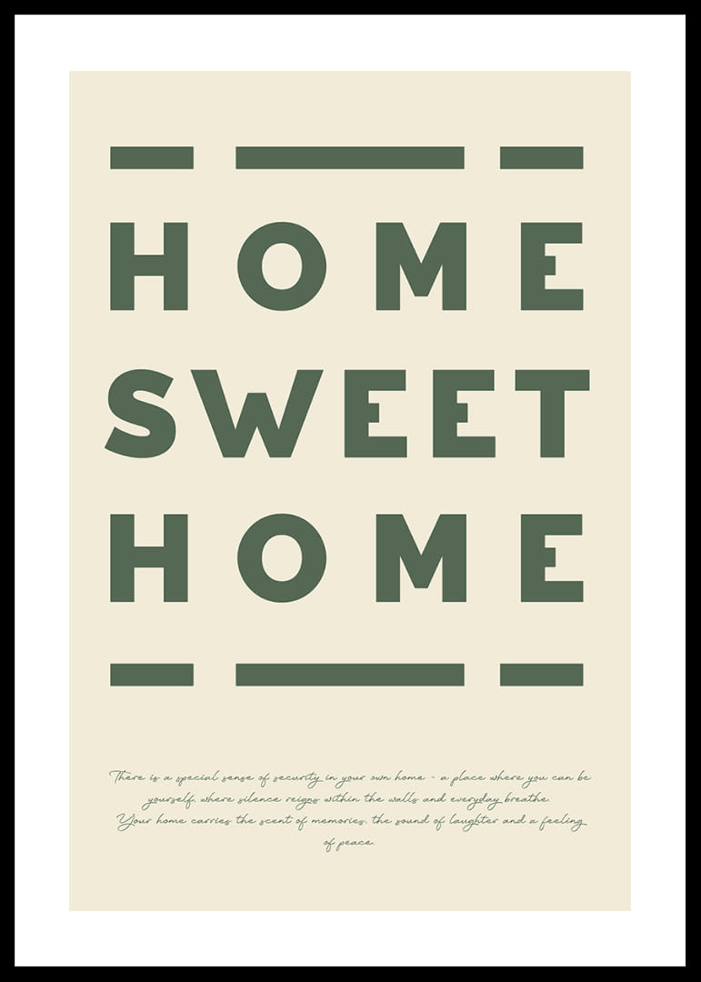 Denna poster fångar essensen av hemmet som en fristad av lugn och glädje. Med djärva bokstäver och en jordnära ton ger den en varm känsla av att höra hemma. Varje gång du ser på denna poster påminns du om hemmets omfamnande säkerhet. Den skapar en atmosfär av trivsel och ro i ditt vardagsrum och förstärker känslan av att vara där du hör hemma.