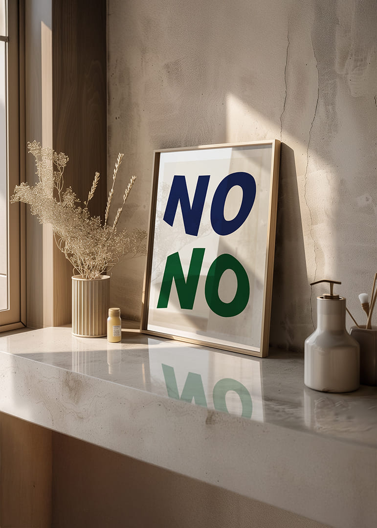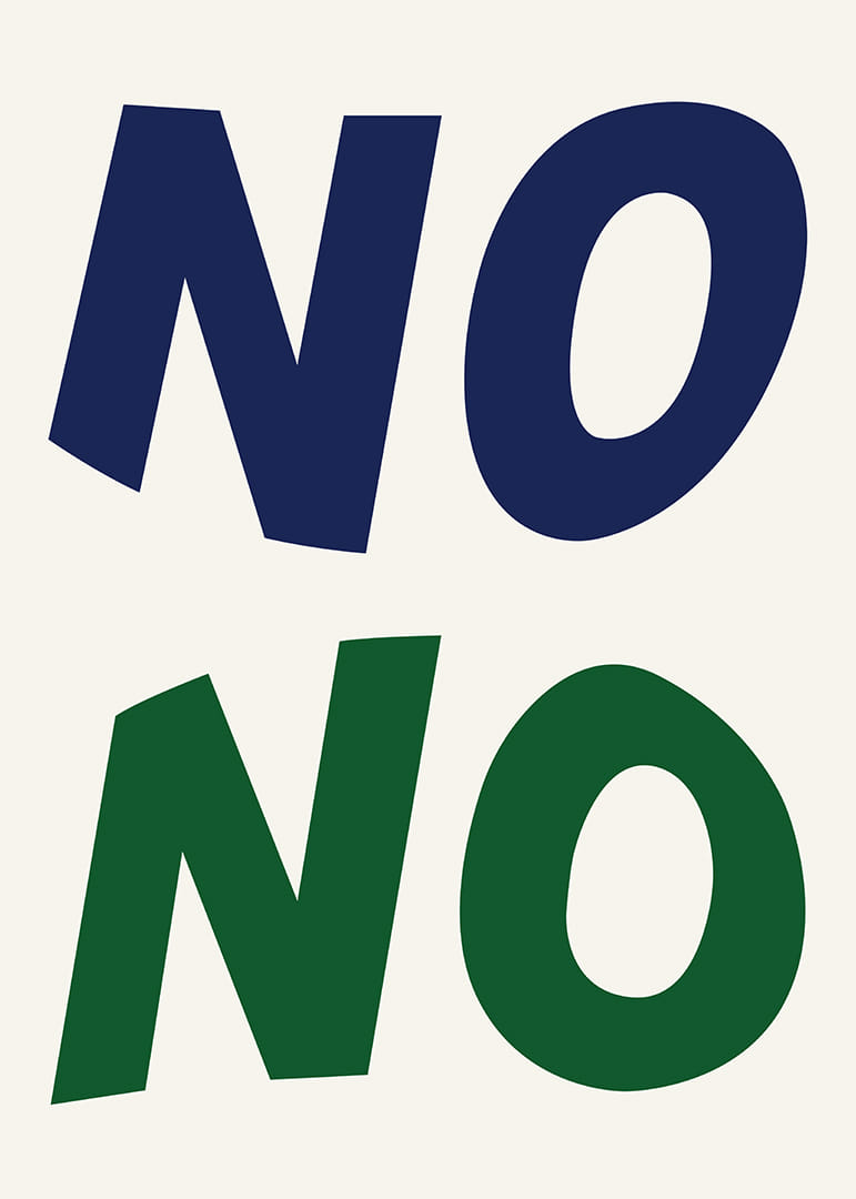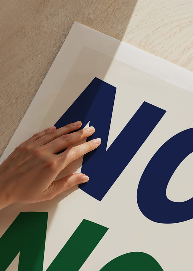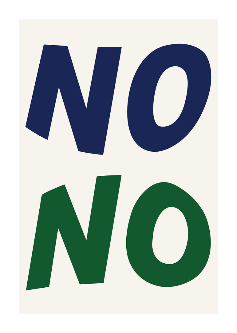 Denna poster fängslar med sina två stora 'NO' i kontrasterande färger, en med djupblått och den andra med skogsgrönt. Orden är framträdande i djärva bokstäver, vilket ger en känsla av bestämdhet och styrka. Postern har en modern, minimalistisk estetik som väcker tankar och diskussion. Dess närvaro i ett rum ger en kraftfull, stilren touch och skapar en dynamisk atmosfär.