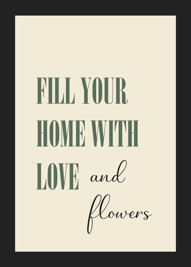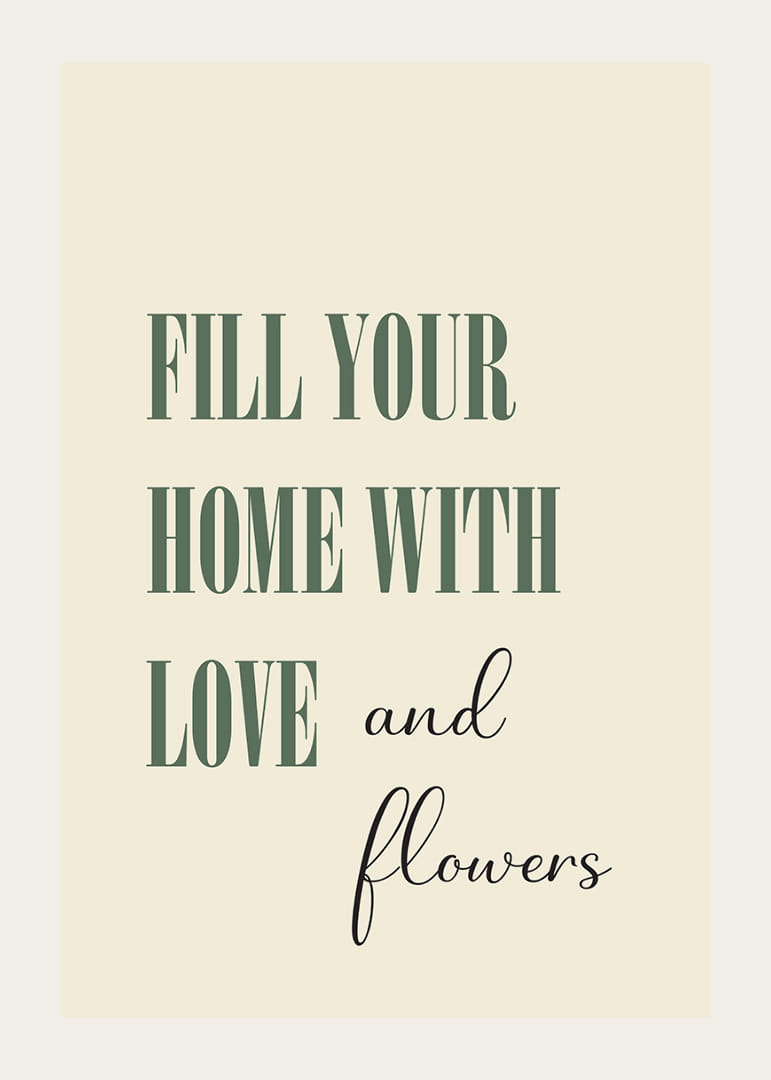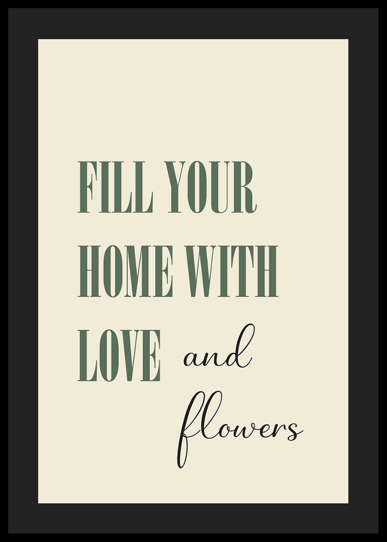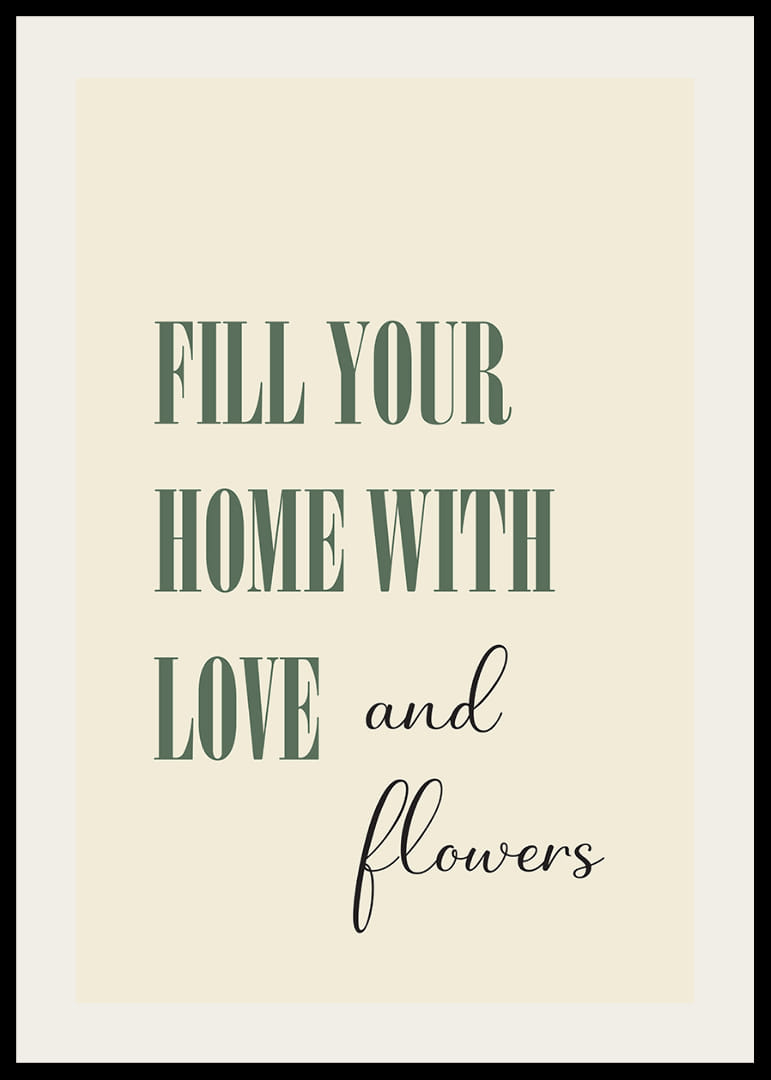 Med en varm och inbjudande stil förmedlar denna poster ett budskap om kärlek och naturens skönhet. Färgerna är mjuka och kompletterar textens kraftfulla budskap om att fylla ditt hem med både kärlek och blommor. Denna poster är perfekt för att skapa en fridfull och inspirerande atmosfär i ditt hem, där varje blick på den påminner om kärlekens värme och livets enkelhet.