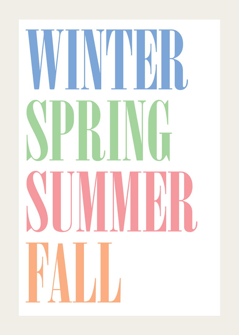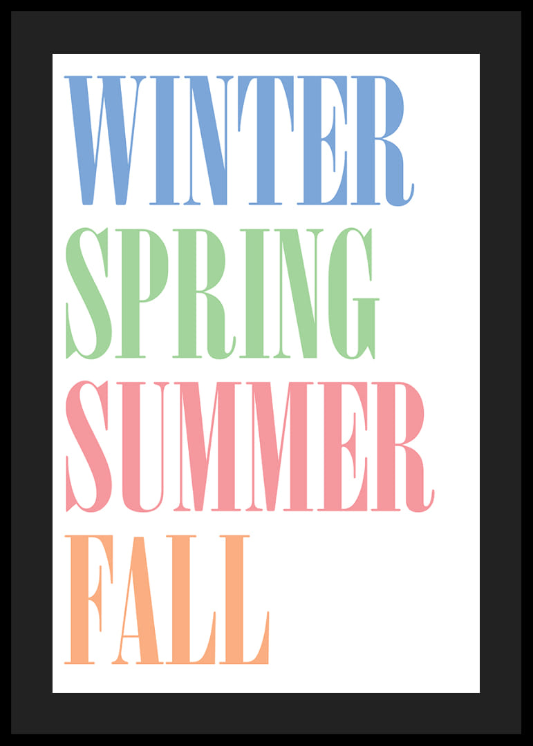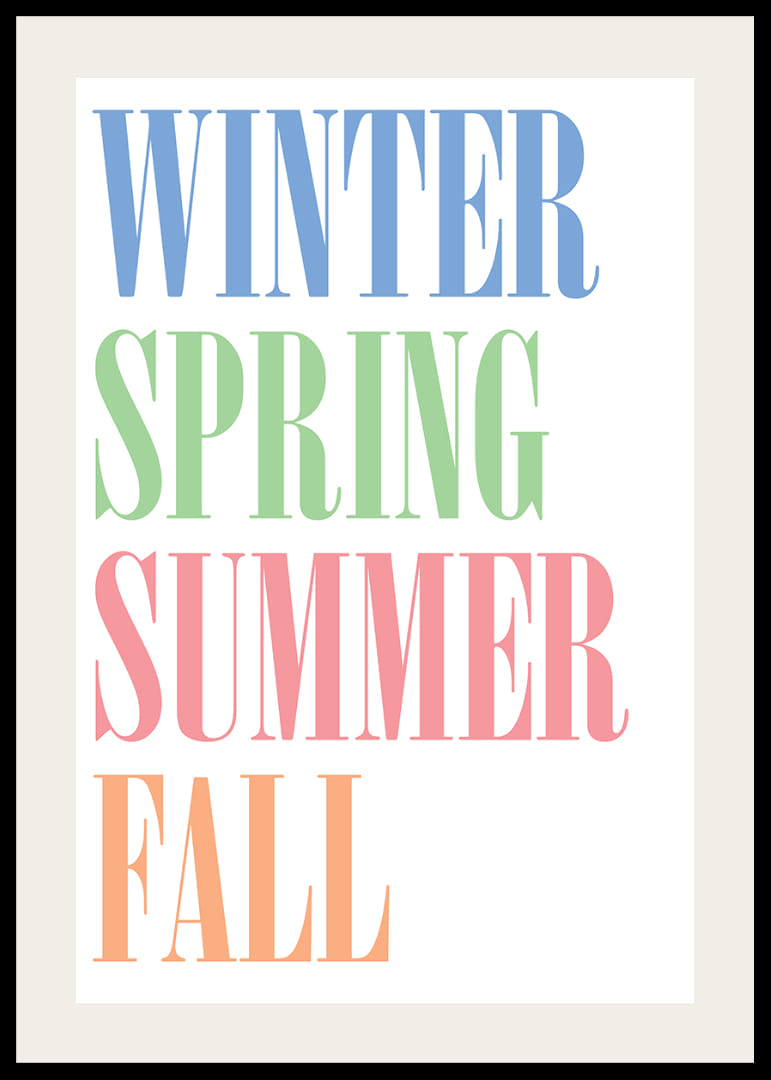 Med en omedelbar känsla av årstidernas växlingar, erbjuder denna poster en elegant och färgrik representation av vinter, vår, sommar och höst. De klara, distinkta färgerna på orden ger varje årstid sin unika charm. Med stilfull typografi skapas en harmonisk balans som väcker liv och glädje. Denna poster är perfekt för att förhöja atmosfären i alla hem med sin tidlöshet och färgprakt.