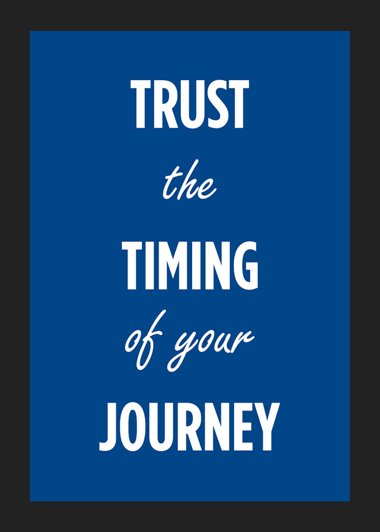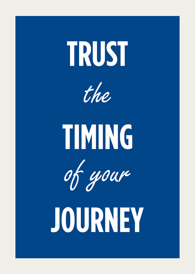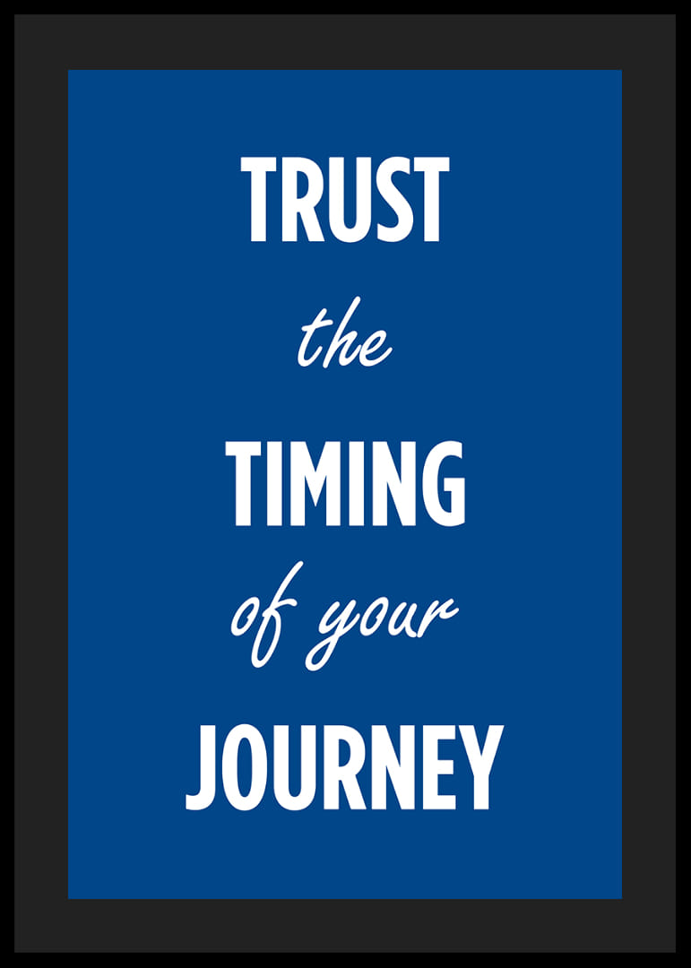 Denna poster fångar essensen av tillit och tajming genom dess inspirerande citat mot en djupblå bakgrund. Med orden som talar direkt till själen skapas en känsla av ro och reflektion. Kontrasten mellan den vita texten och den blå bakgrunden skapar en visuellt slående effekt. Det är en poster som tillför en känsla av lugn och inspiration till vilket rum den än pryder.