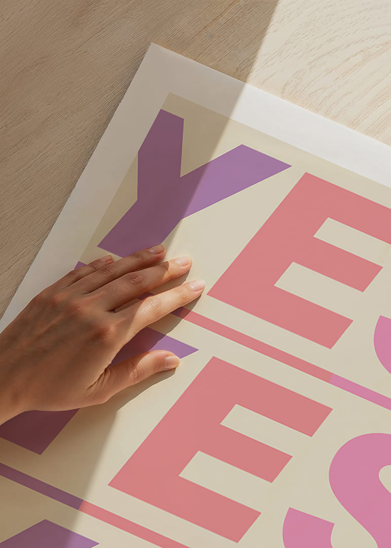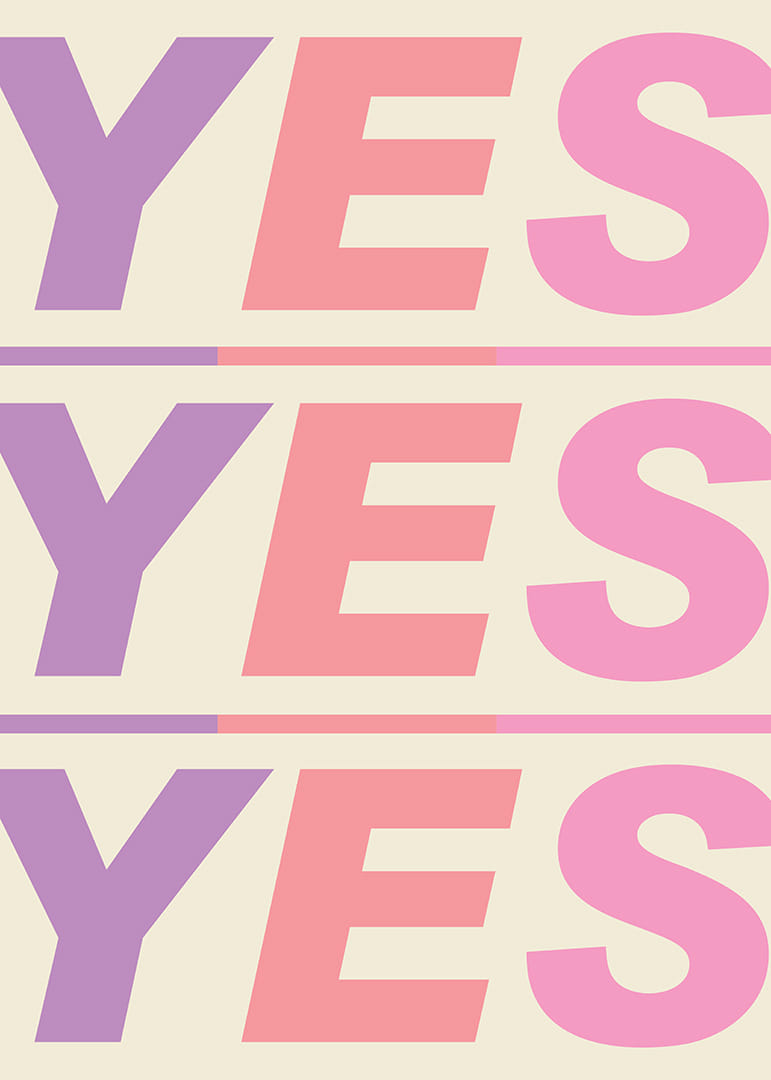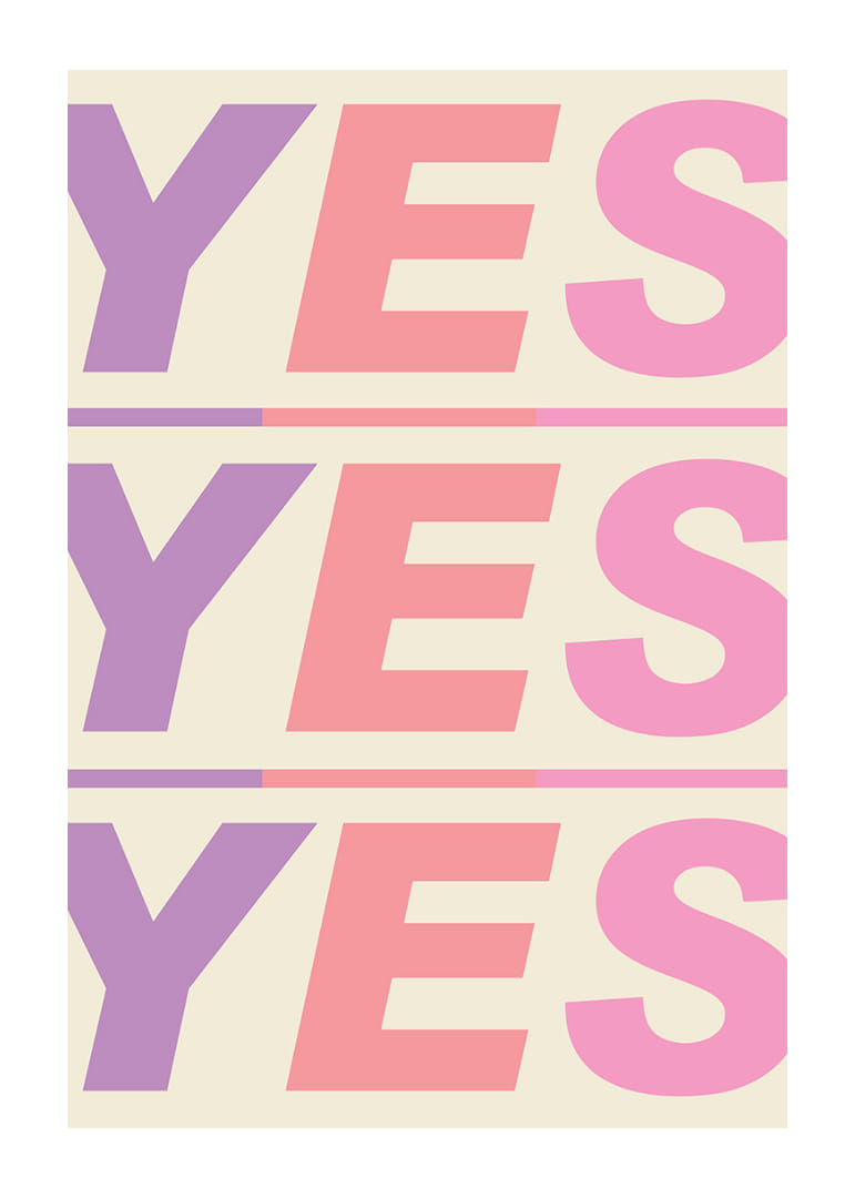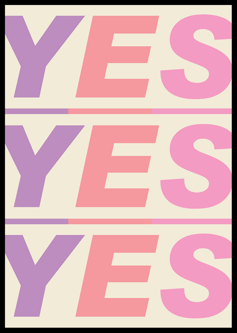 Denna poster utstrålar energi och livfullhet med sina starka färger och frimodiga "JA" som upprepas tre gånger i olika nyanser. Dess dynamiska utstrålning fyller rummet med en känsla av positivitet och engagemang, perfekt för att liva upp vardagsrum eller kontor. Postern blir en ständigt inspirerande närvaro som uppmuntrar till optimism och framåtanda i varje ögonblick.