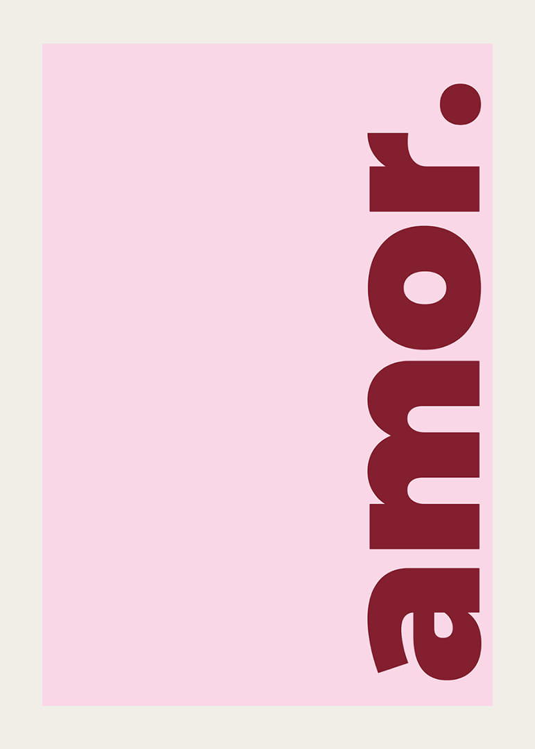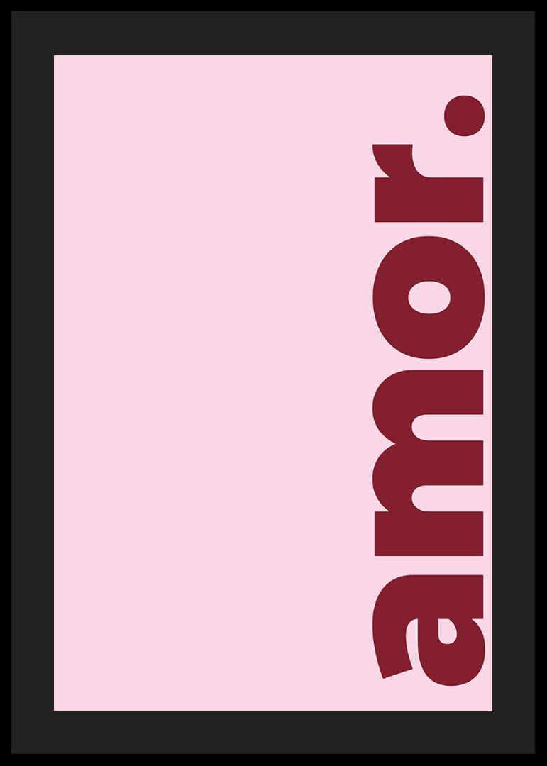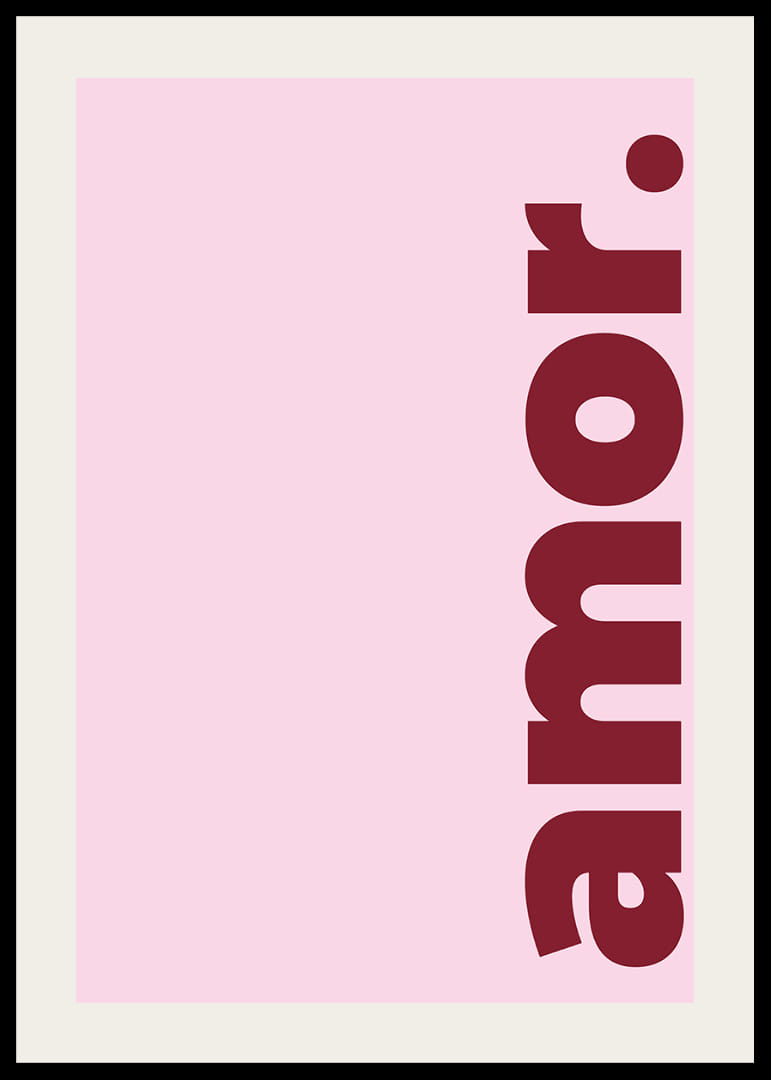 Denna poster fångar omedelbart uppmärksamheten med sitt djärva röda 'amor' mot en mjuk rosa bakgrund. Färgernas kontrast framhäver ordets passionerade innebörd och skapar en varm och inbjudande känsla. Postern förvandlar vilken miljö som helst med sin romantiska charm, och tillför en elegant och subtil touch av kärlek till ditt hem. Perfekt för att skapa en stämningsfull och harmonisk atmosfär.