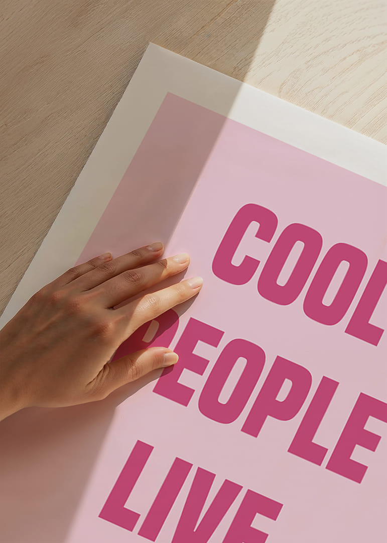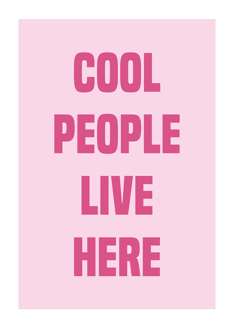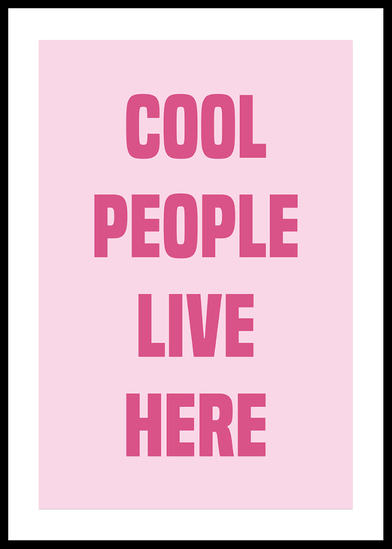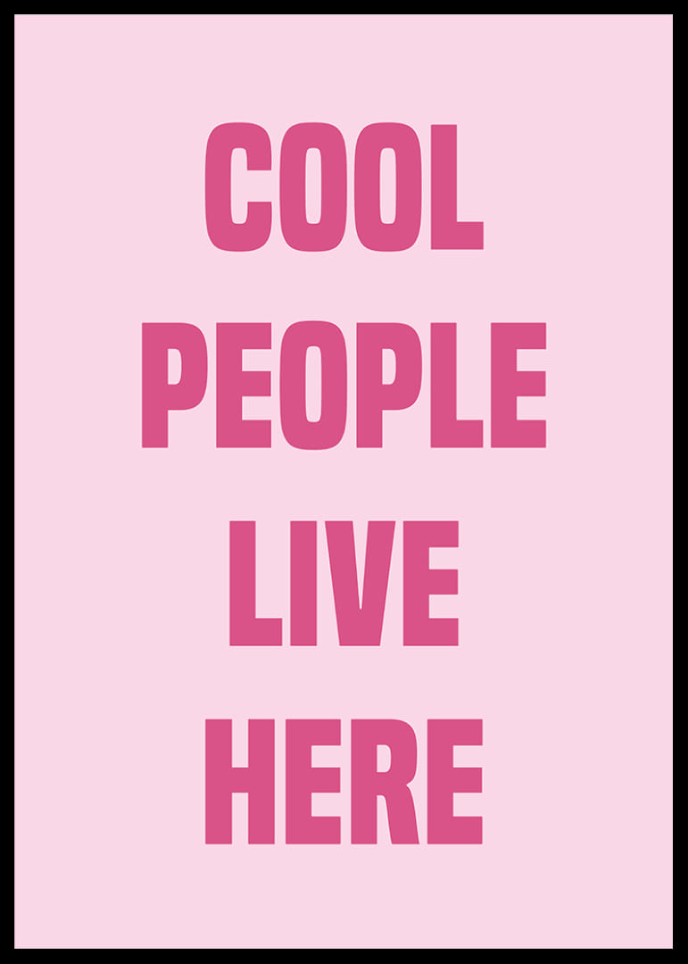 Denna poster utstrålar självsäkerhet och stil med sina djärva rosa bokstäver mot en mjuk bakgrund. Orden "Cool People Live Here" skapar en modern och inbjudande känsla som passar perfekt i ett trendigt vardagsrum eller sovrum. Postern förvandlar vilket rum som helst till ett uttryck för individualitet och urban elegans, och ger hemmet en touch av sofistikation och lekfullhet.