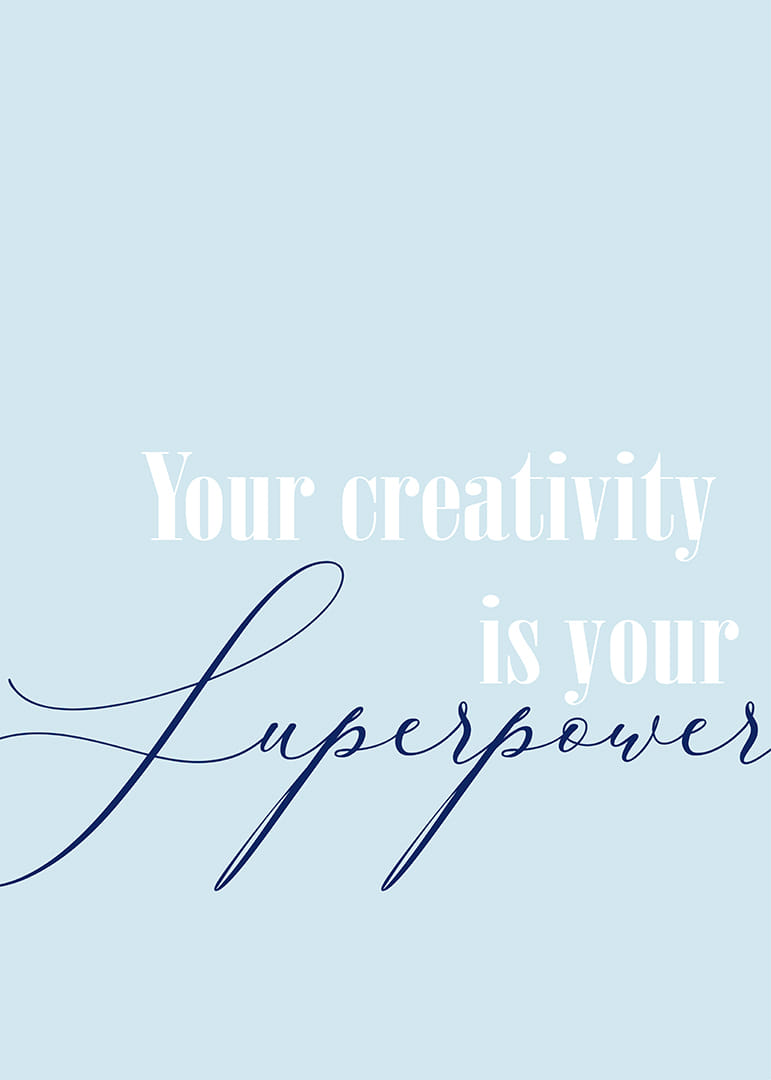 Denna poster fångar omedelbart betraktarens uppmärksamhet med sitt starka budskap: 'Din kreativitet är din superkraft.' Den stilfulla typografin och de harmoniska blå tonerna förstärker känslan av lugn och självtillit. Den är en perfekt dekoration för alla rum, där den skapar en atmosfär av inspiration och möjlighet, vilket gör sig väl i både arbets- och hemmiljöer.