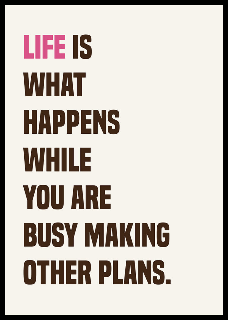 Denna poster fångar livets oberäkneliga natur med tydlighet och skärpa. Med orden i starka kontraster och ett enkelt, stilrent typsnitt, påminner den oss om att livet sällan går enligt planerna. Textens placering skapar en visuellt tilltalande upplevelse som ger djup och tanke till alla rum. På väggen fungerar postern som en daglig påminnelse om att njuta av det oväntade och värdet av nuet.