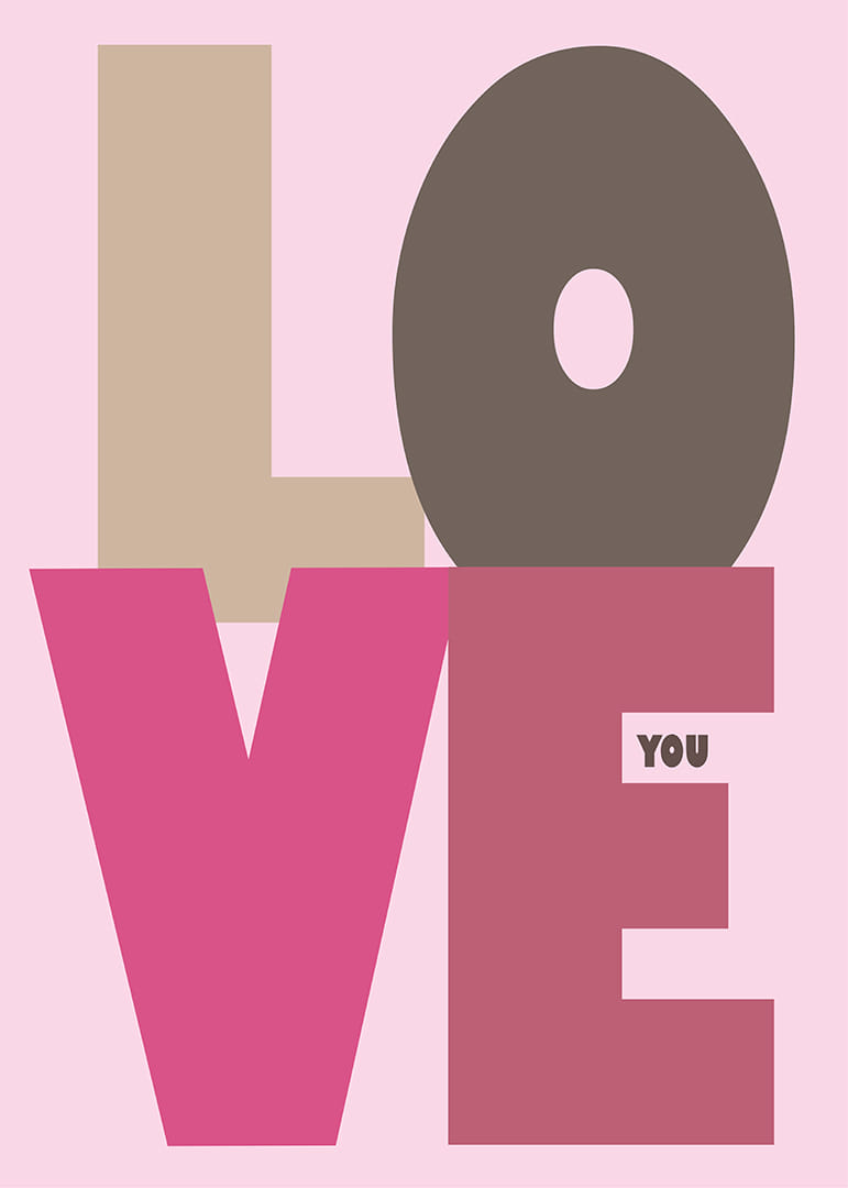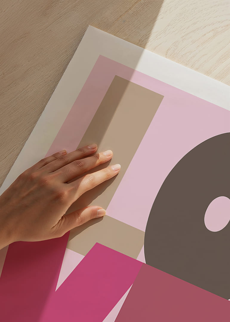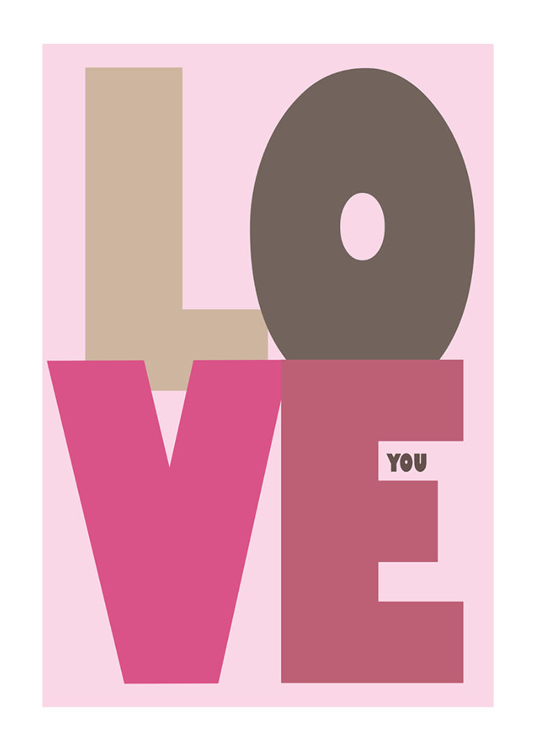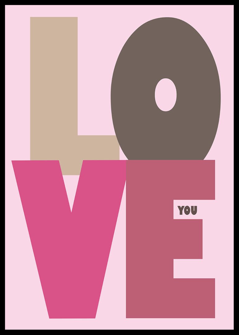 Denna poster fångar ögonblicket av kärlekens intensitet genom sin djärva typografi och rika färgpalett. Bokstäverna formar ordet 'LOVE' med stark stil och kontrast, vilket ger ett kraftfullt och stilrent intryck. Färgnyanserna av rosa och beige smälter samman för att skapa en varm och inbjudande atmosfär. Som en central del av ditt hem sprider denna poster ett kärleksfullt budskap och förhöjer din inredning.