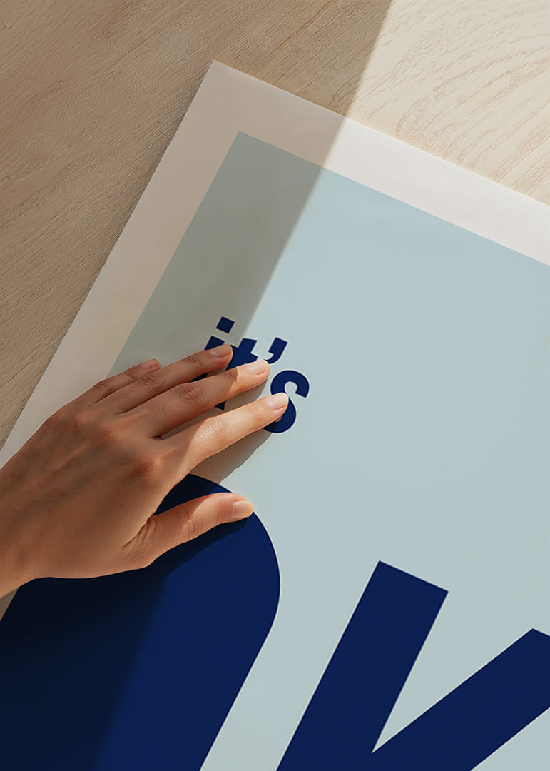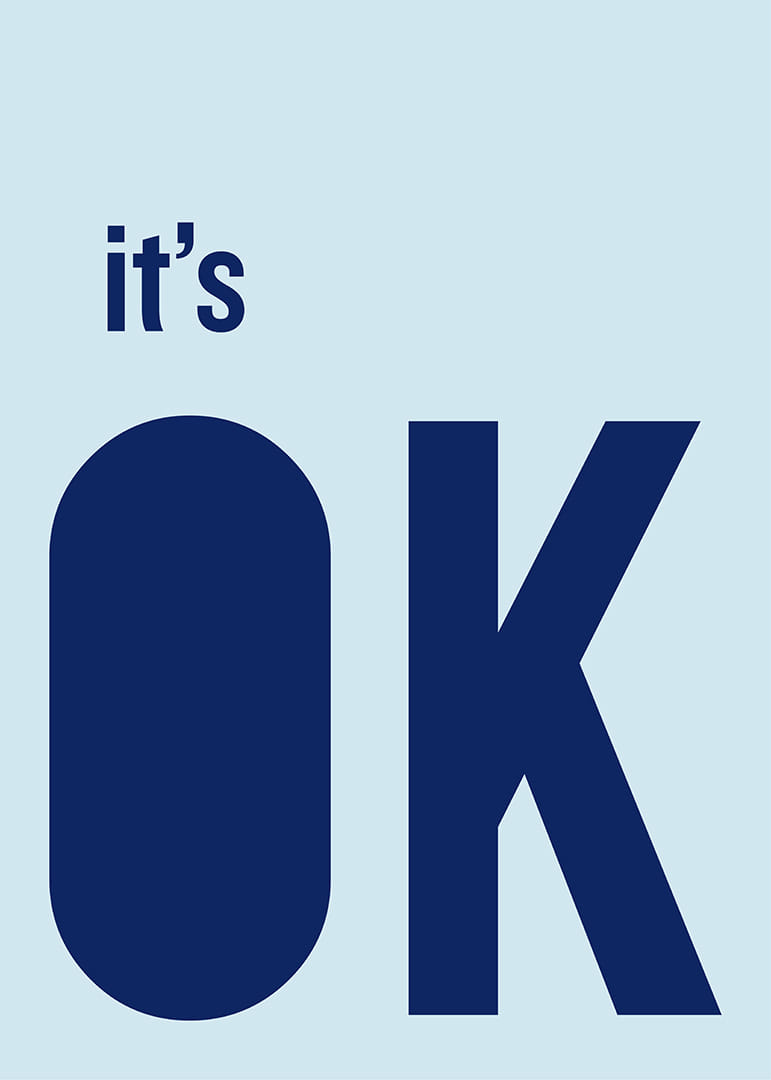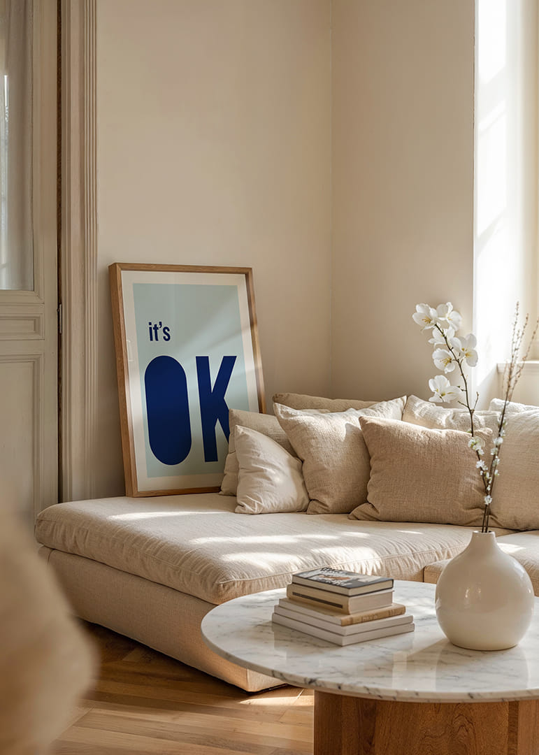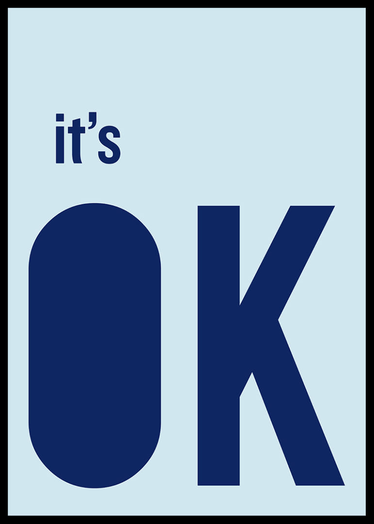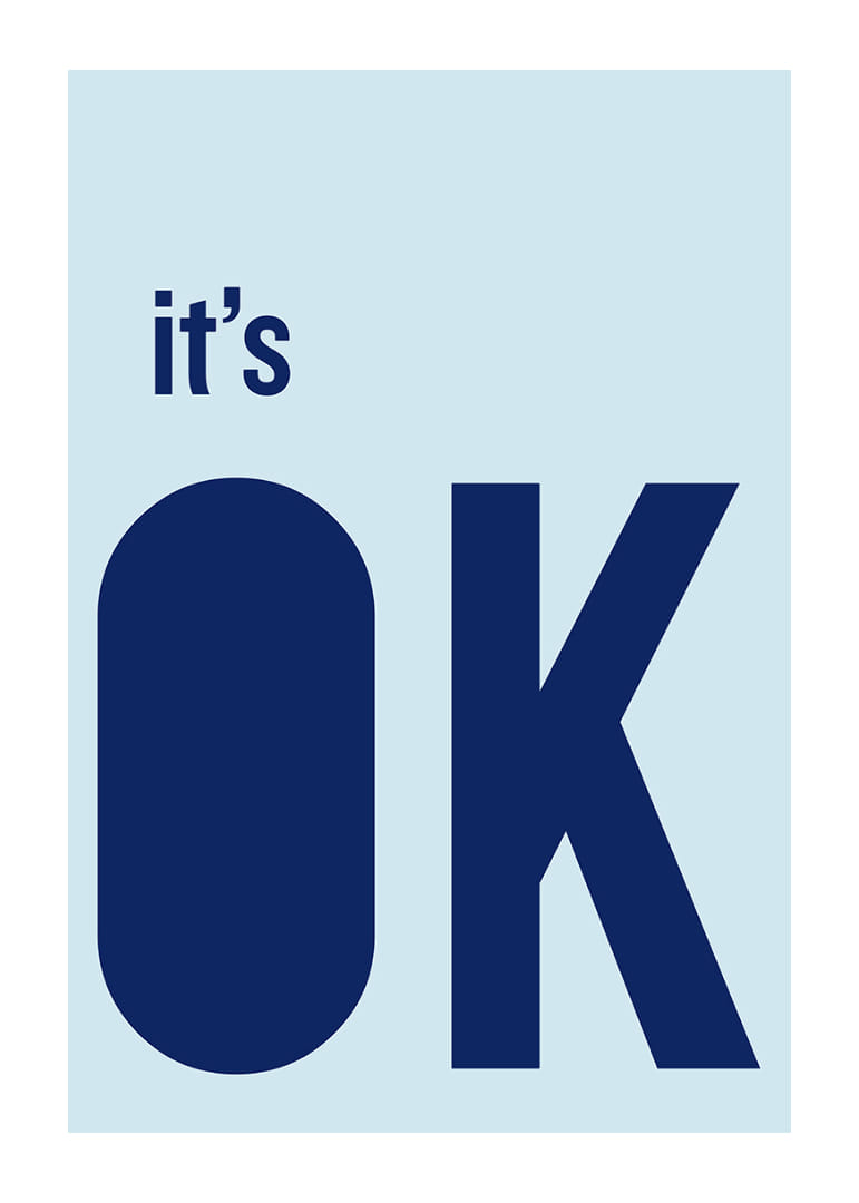 Denna poster förmedlar en känsla av lugn med sin minimalistiska design och det starka budskapet "it's OK" i djupblått mot en mjuk blå bakgrund. De rena linjerna och det lugnande färgvalet gör denna poster till en perfekt detalj för alla rum som behöver en touch av enkelhet och positivitet. Denna poster bidrar till en avslappnad och harmonisk atmosfär, som ger en påminnelse om att allt står rätt till.
