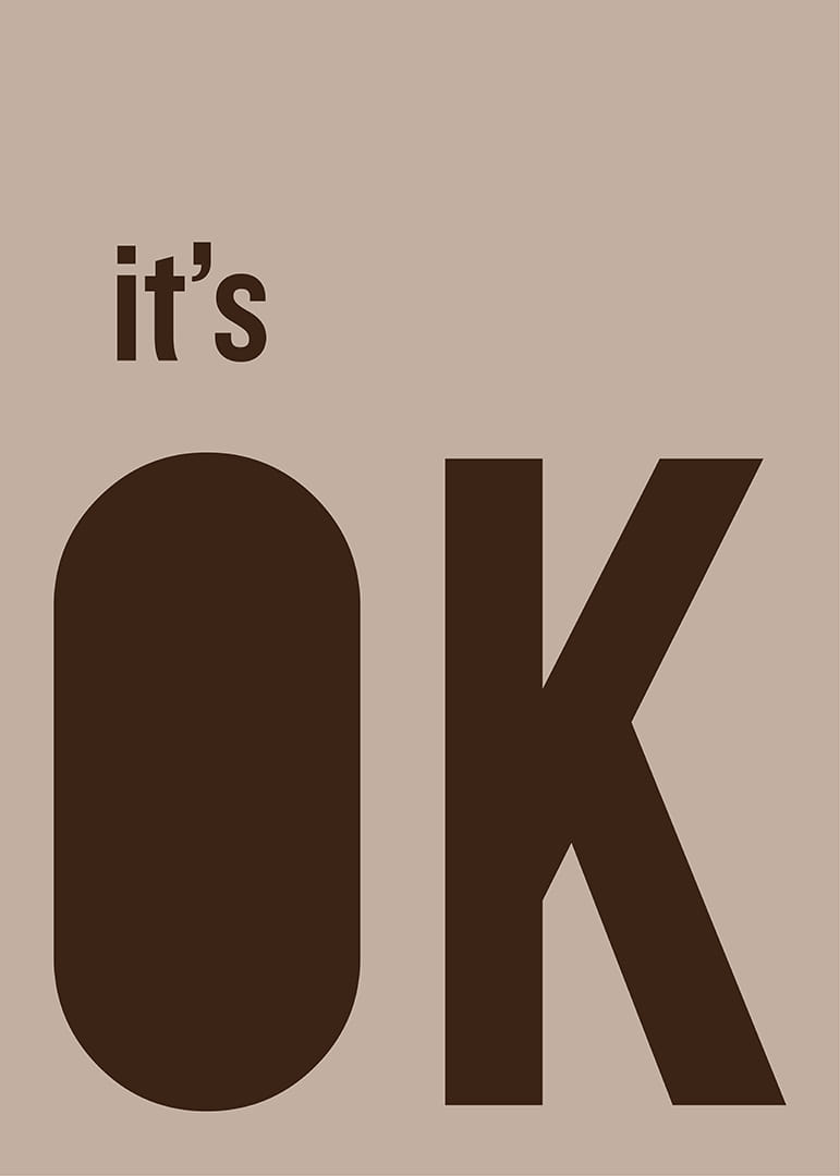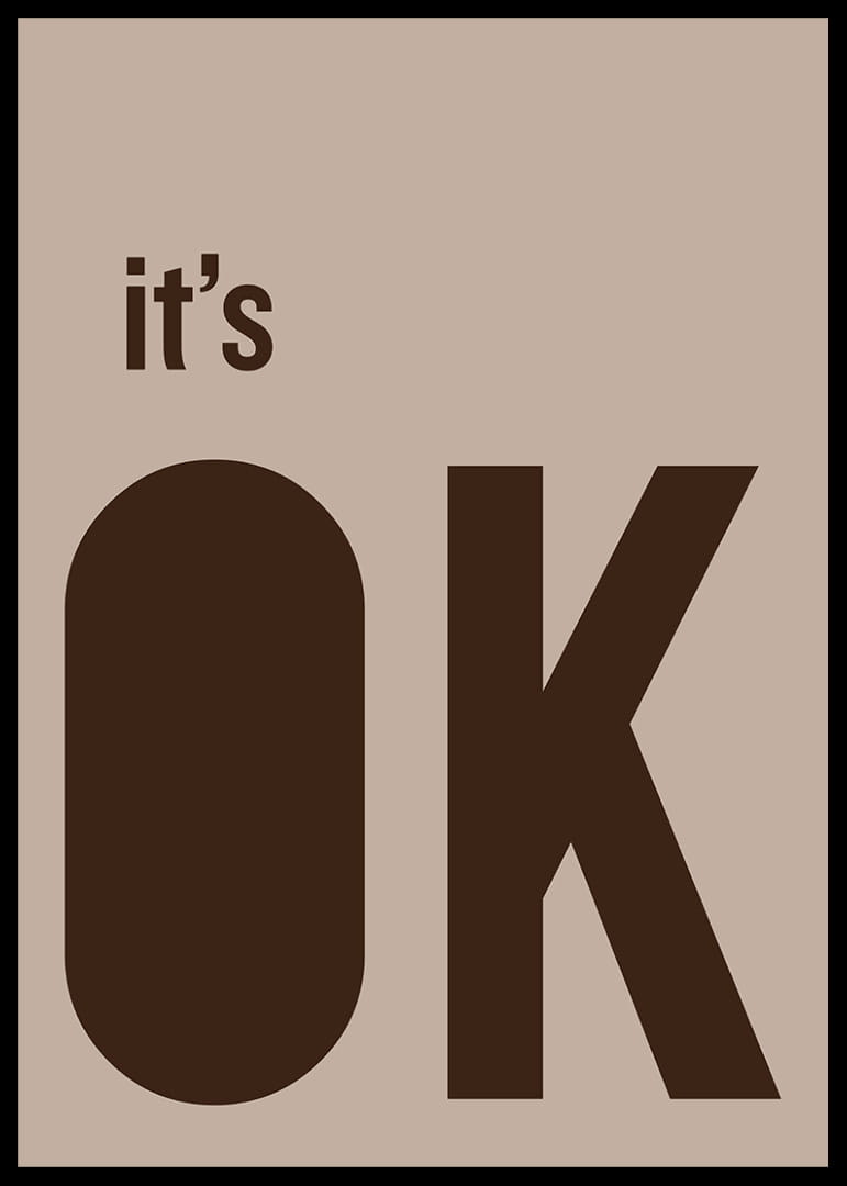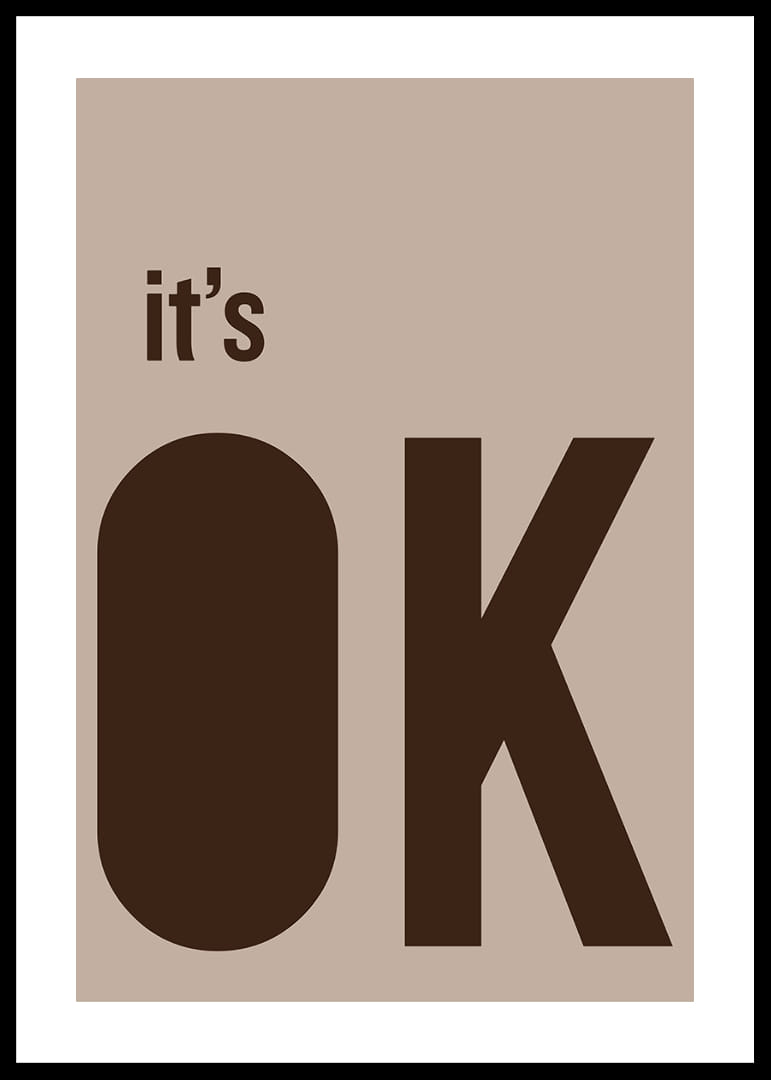 Denna stilrena poster erbjuder en lugn och tröstande påminnelse med sitt enkla meddelande, 'it's OK'. Den mjuka jordtonspaletten skapar en varm och inbjudande känsla som lätt smälter in i alla miljöer. Den harmoniska designen i postern ger en känsla av trygghet och ro, vilket gör den perfekt för att skapa en avkopplande atmosfär i ditt hem.