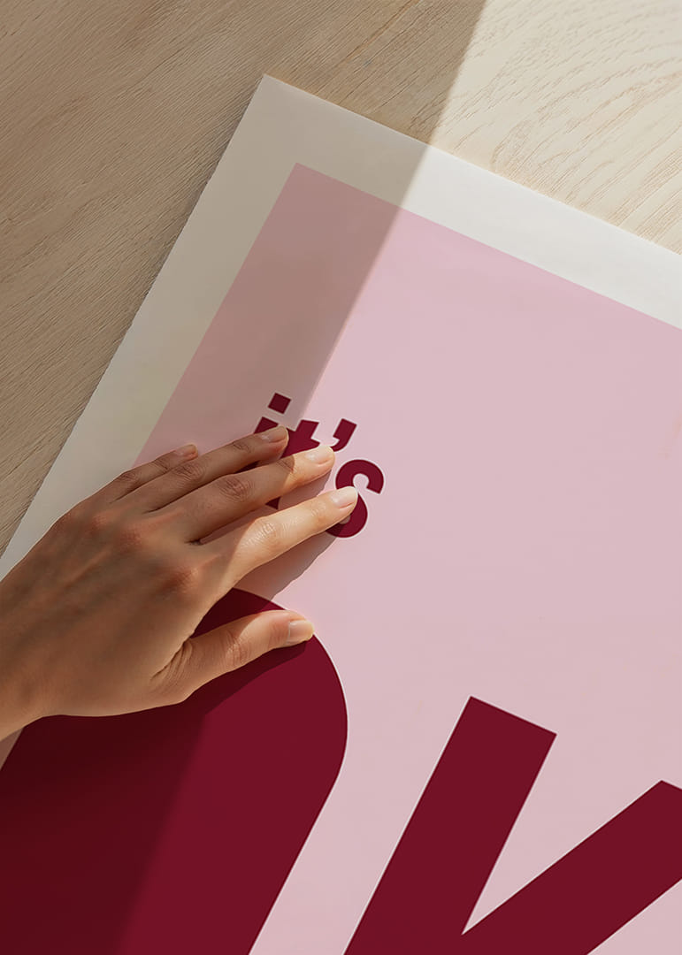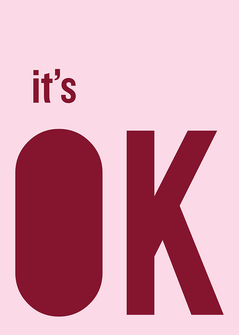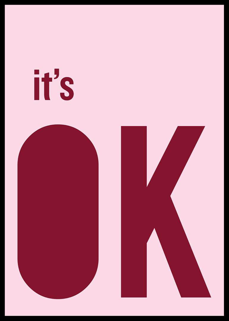 Den här postern fångar ögat med sin minimalistiska rosa och röda färgpalett som ger en känsla av lugn och trygghet. De djärva bokstäverna och det enkla budskapet 'it's OK' förmedlar en känsla av subtil styrka och säkerhet. Postern fungerar utmärkt i vilket rum som helst, och dess mjuka men självsäkra uttryck bidrar till en harmonisk och avslappnad atmosfär i hemmet.