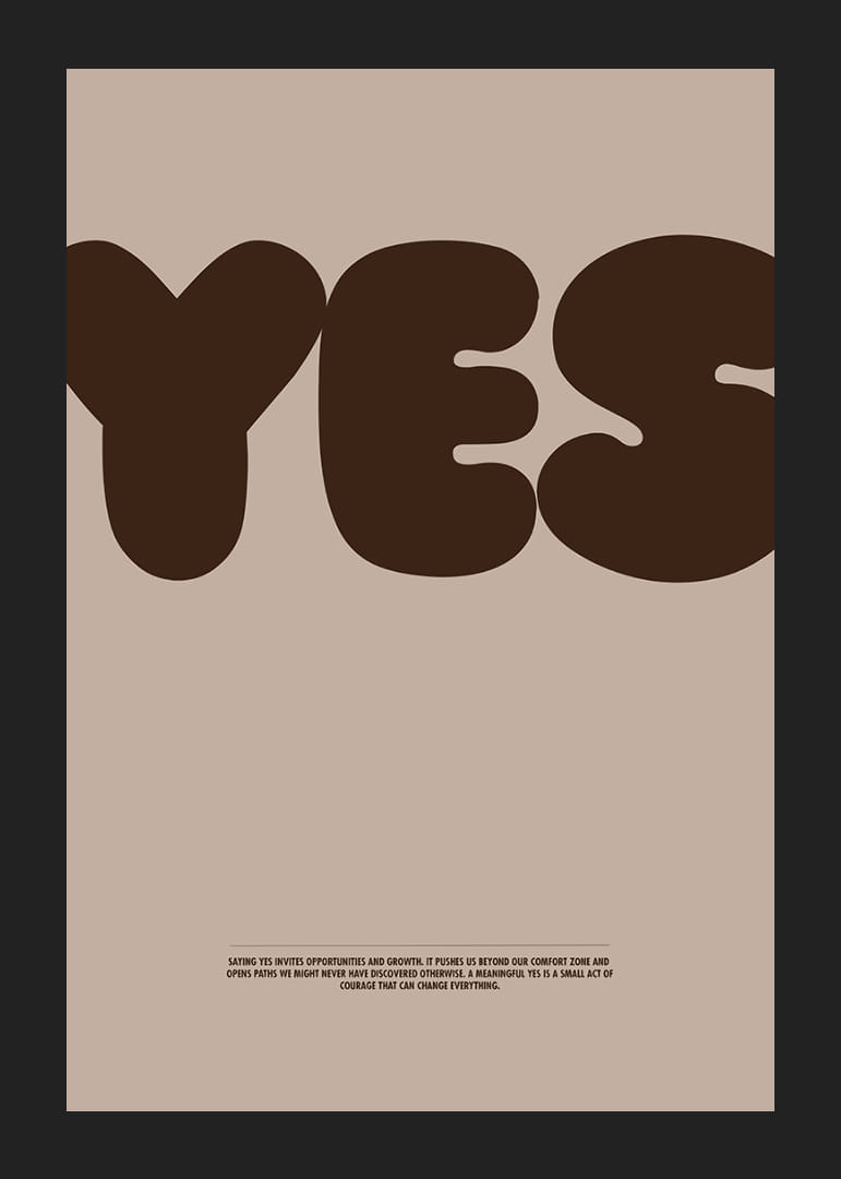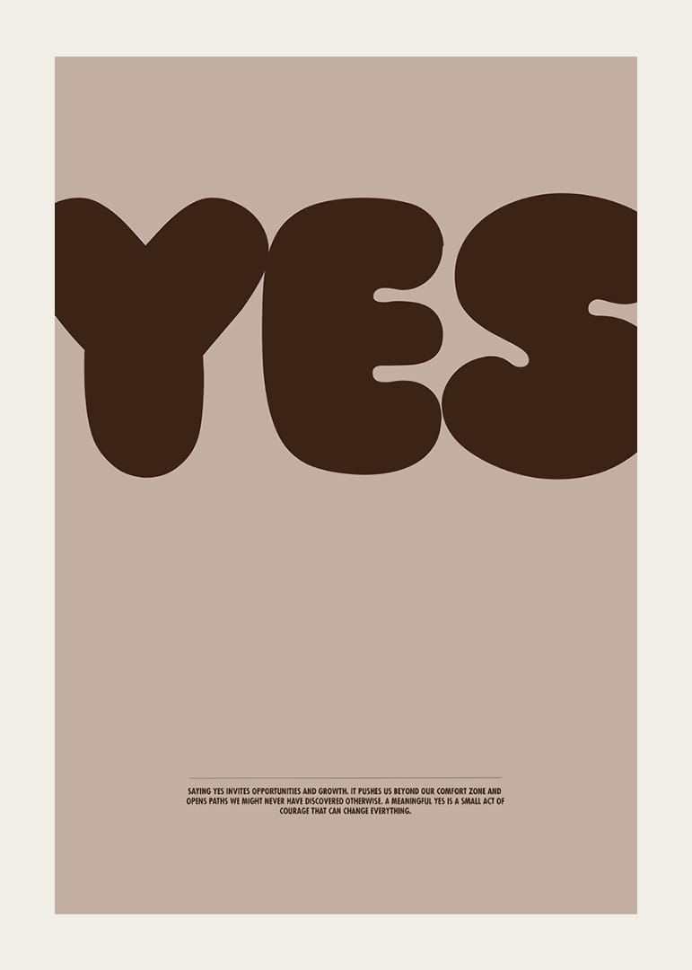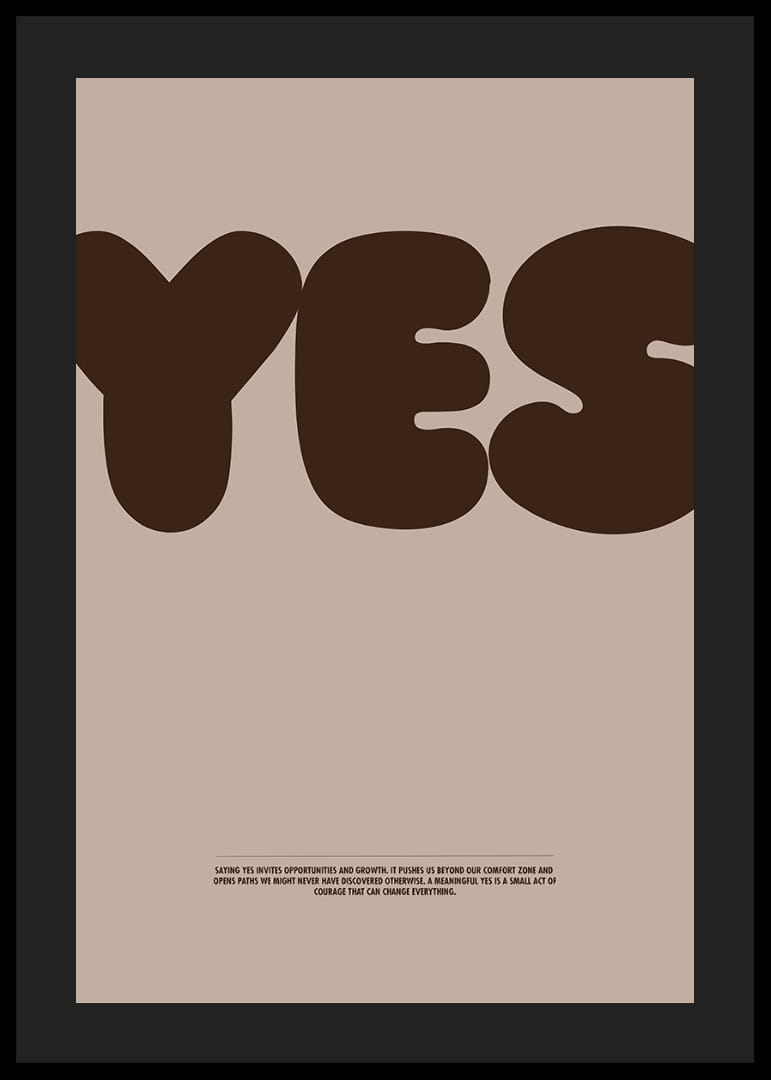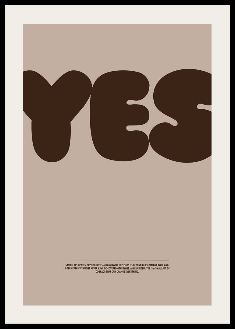 Denna poster fångar dig direkt med sitt stora, självsäkra "YES" i djupa jordtoner, vilket skapar en känsla av affirmation och positivitet. Färgerna ger en naturlig och varm atmosfär som gör sig perfekt i vilket hem som helst. Postern representerar mod och det nya, en påminnelse om att säga ja till möjligheter. En stilren detalj som lyfter rummet och sprider en inspirerande energi i ditt hem.