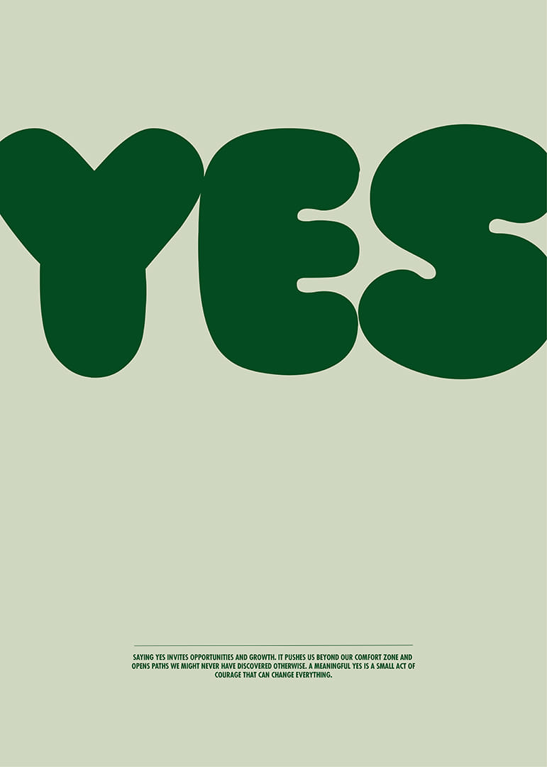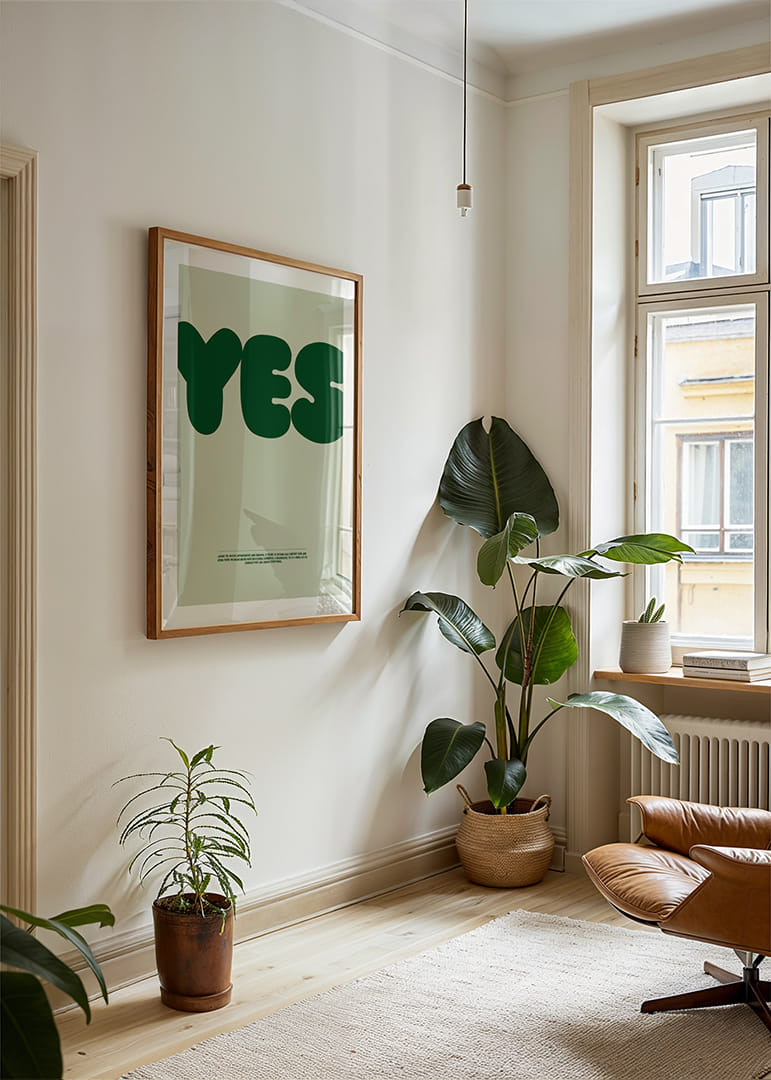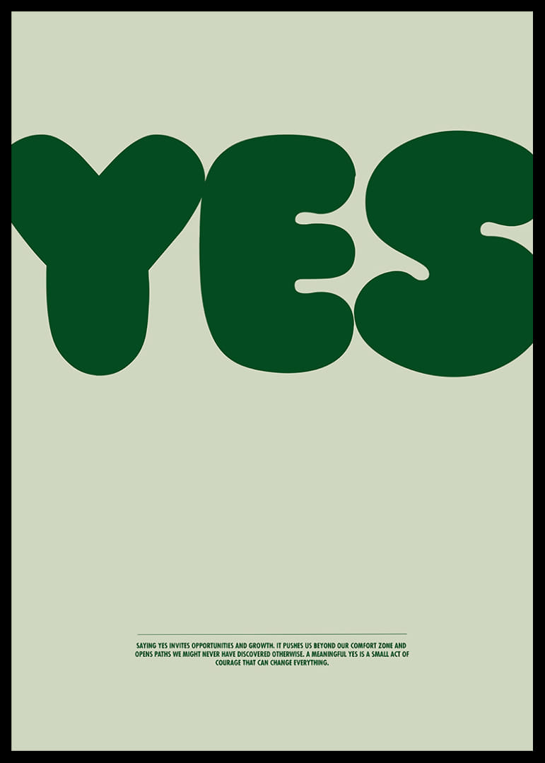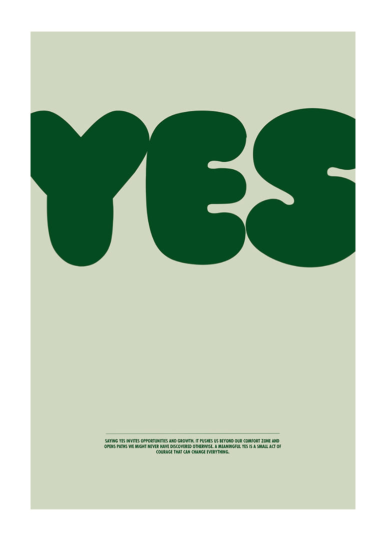 Denna poster utstrålar positivitet med sitt kraftfulla "JA" i djupgrön ton, vilket skapar en känsla av hopp och tillförsikt. Den stora och inbjudande typografin fångar omedelbart uppmärksamheten och erbjuder en upplyftande energi som inspirerar till handling och förändring. Perfekt för att ge liv åt vilket rum som helst, denna poster fungerar som en daglig påminnelse om potential och tillväxt.