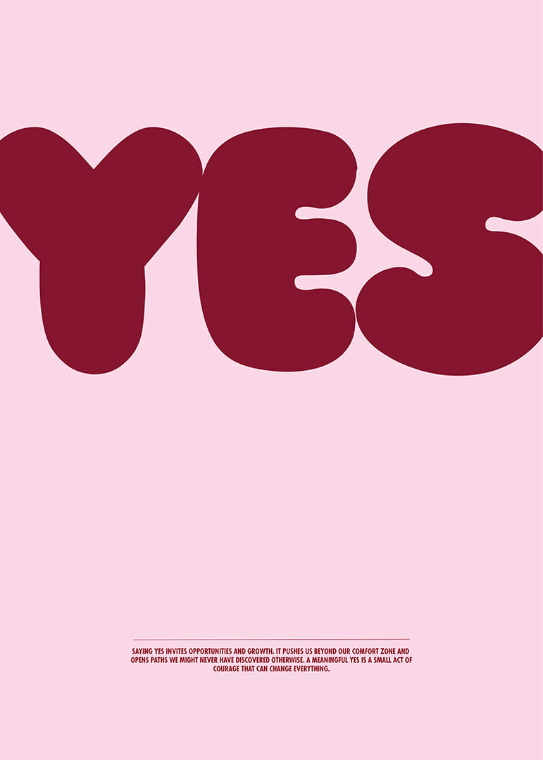Det kraftfulla "JA" på denna poster utstrålar en känsla av styrka och öppenhet för nya äventyr. Bokstäverna dominerar med sin djärva röda färg mot en mjuk rosa bakgrund, vilket skapar en harmoni mellan beslutsamhet och vänlighet. Postern ger rummet en energi av positivitet och inspiration, perfekt för den som vill påminna sig själv om att säga ja till livet och dess oändliga möjligheter.