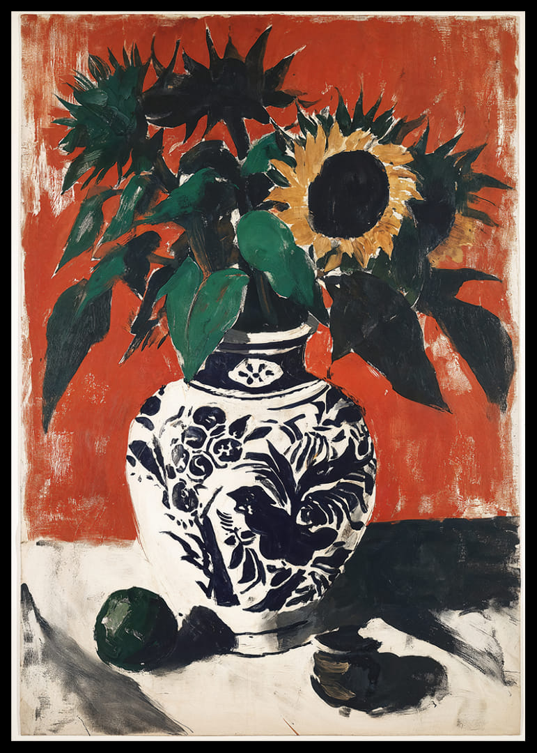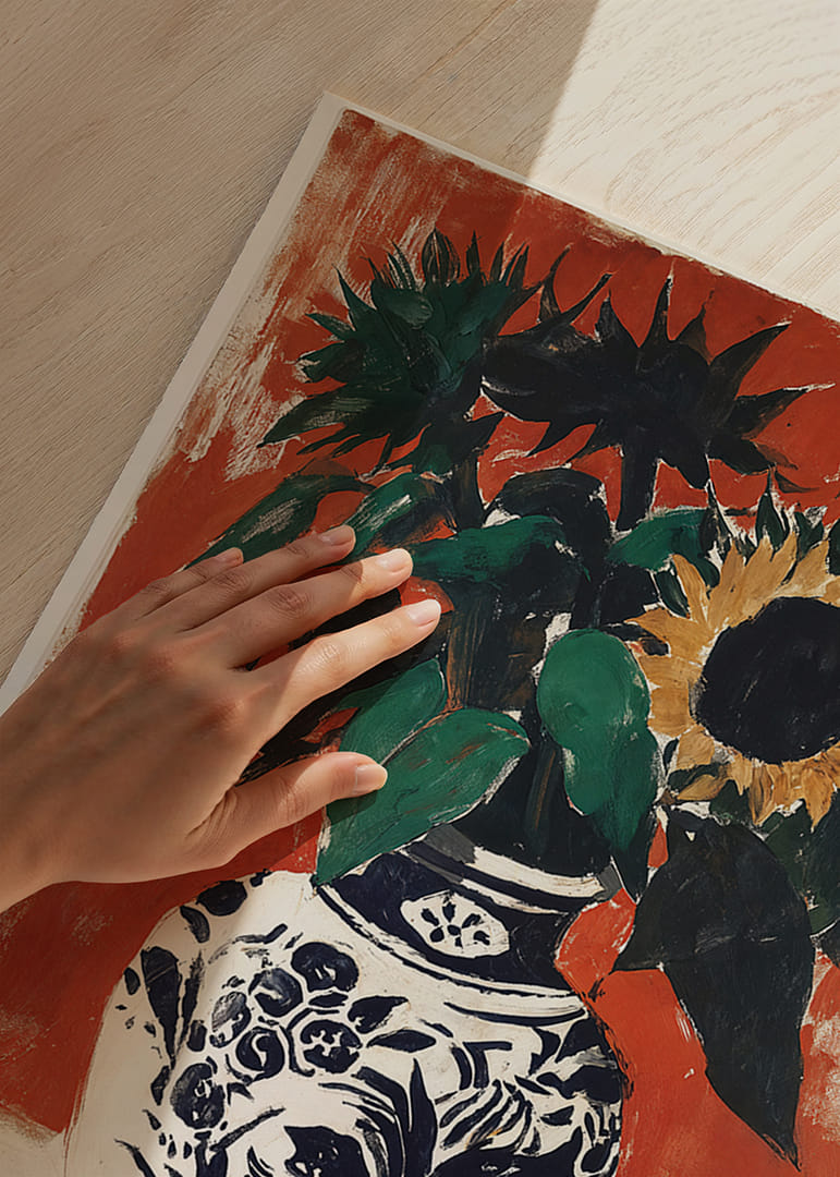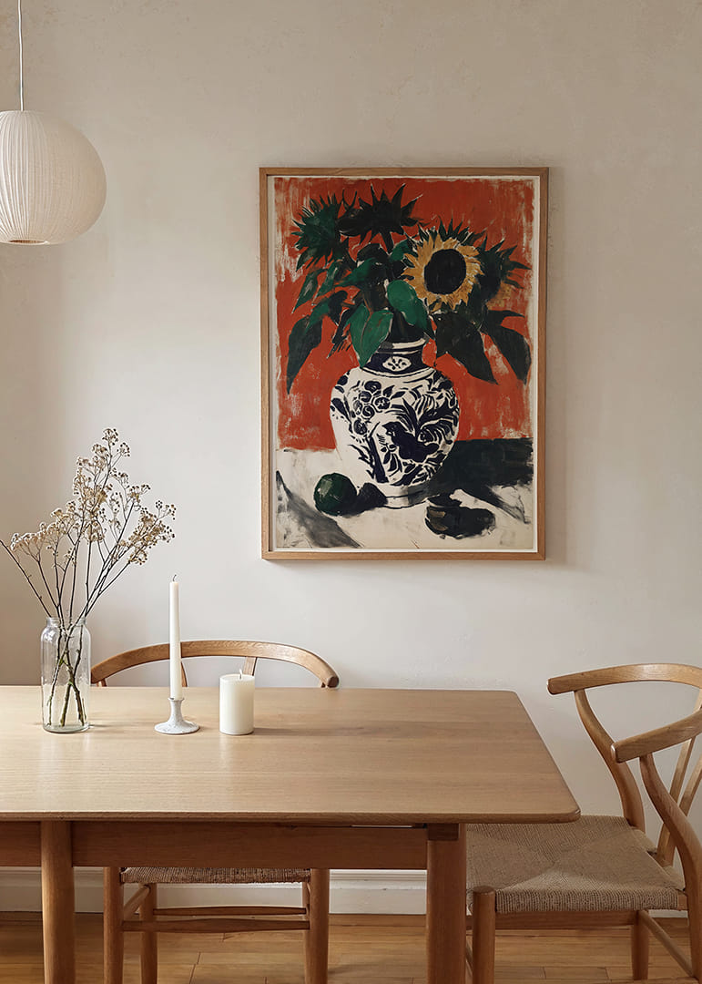 Denna poster förmedlar en tidlös känsla av elegans med sin djärva röda bakgrund som framhäver det solfyllda blomsterarrangemanget. De levande färgerna och den detaljerade vasen skapar en varm atmosfär med klassisk charm. Perfekt för att ge ditt rum en konstnärlig och sofistikerad touch, lyfter denna poster verkligen fram skönheten i ditt hem och skänker en fridfull harmoni.