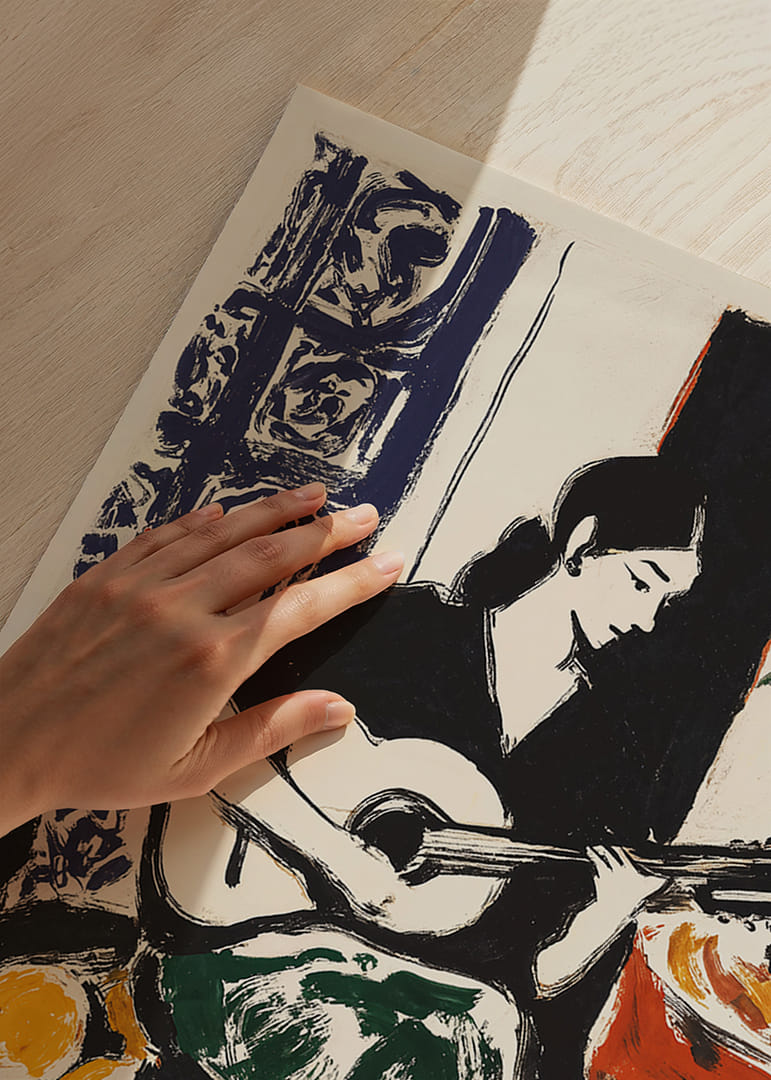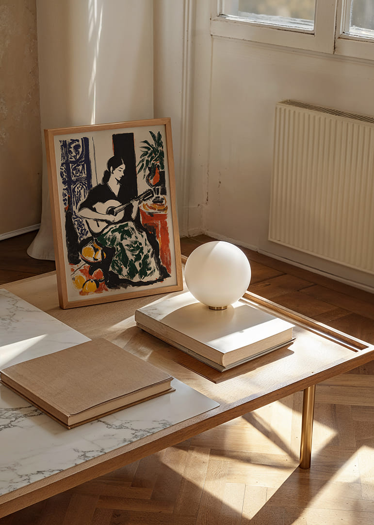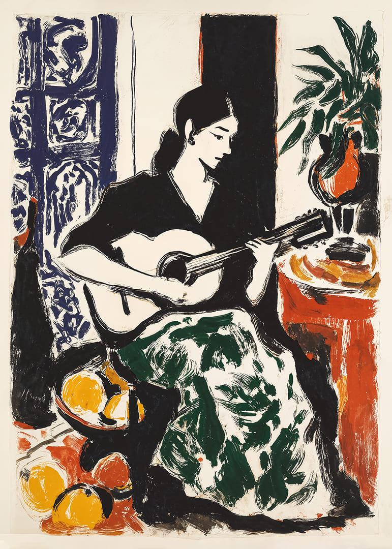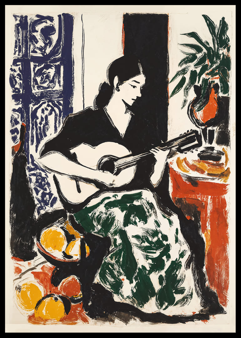 Med intensiva färger och djärva penseldrag fångar denna poster en kvinna försjunken i att spela gitarr. Hennes eleganta silhuett kontrasterar mot en bakgrund fylld av färgglada detaljer som frukt och växter. Harmonin i bilden ger en känsla av stillhet och kreativitet. Med sin vibrerande energi förhöjer postern varje rum och förvandlar det till en plats av konstnärlig inspiration.