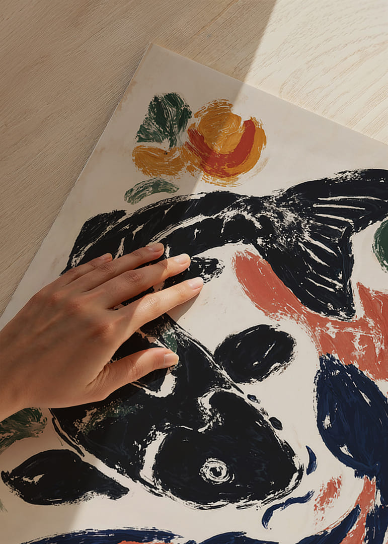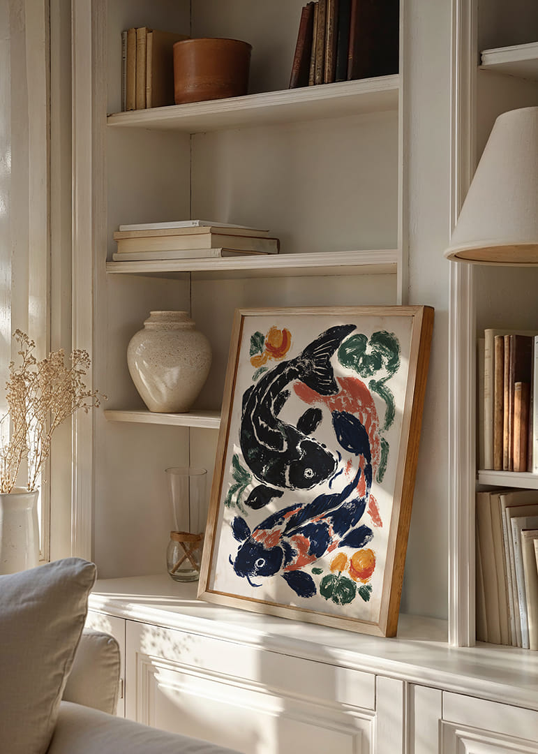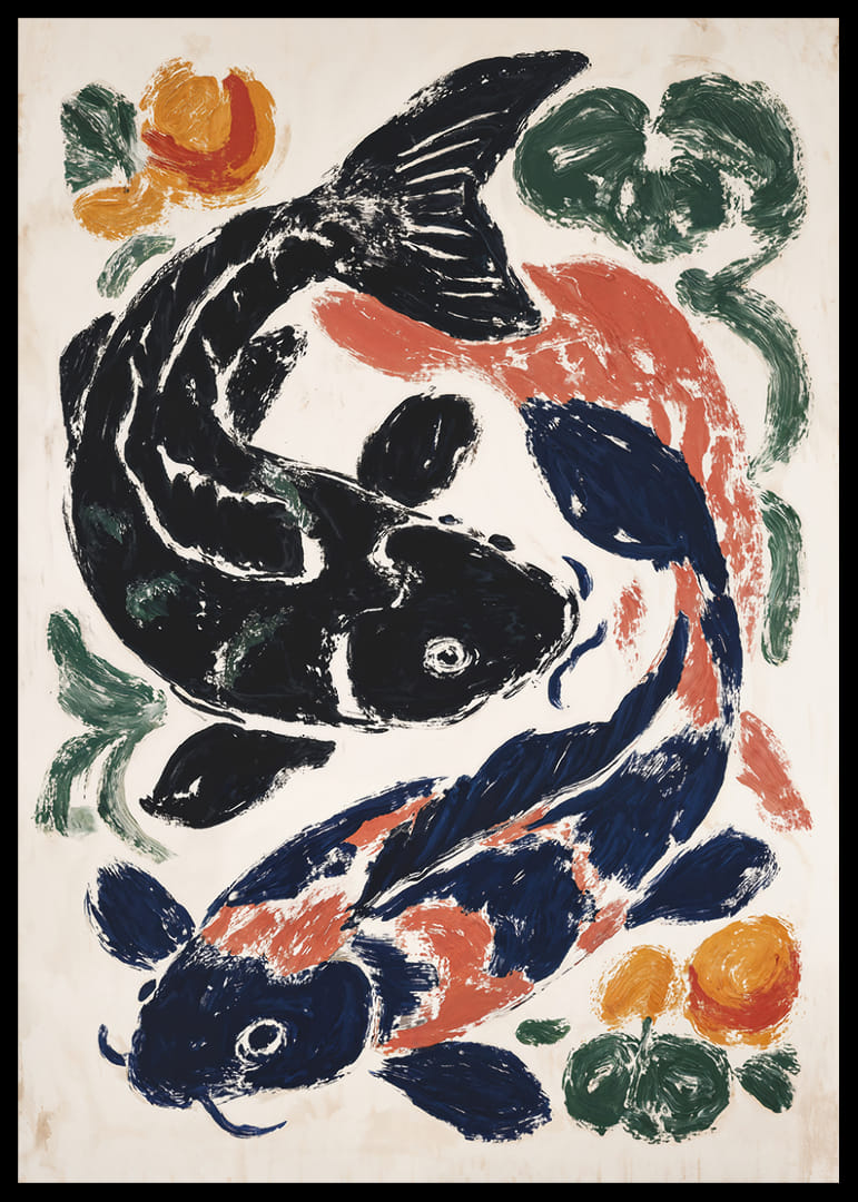 Poster med två koi-fiskar som flyter mjukt i en elegant dans, omgivna av subtila färger som ger en känsla av lugn och balans. De kontrasterande tonerna, från djup marinblå till varm orange, skapar ett visuellt mästerverk som fångar betraktaren. Denna poster förhöjer känslan av stillhet och sofistikering i vilket rum som helst, och blir ett tidlöst tillskott i din vardagsmiljö.