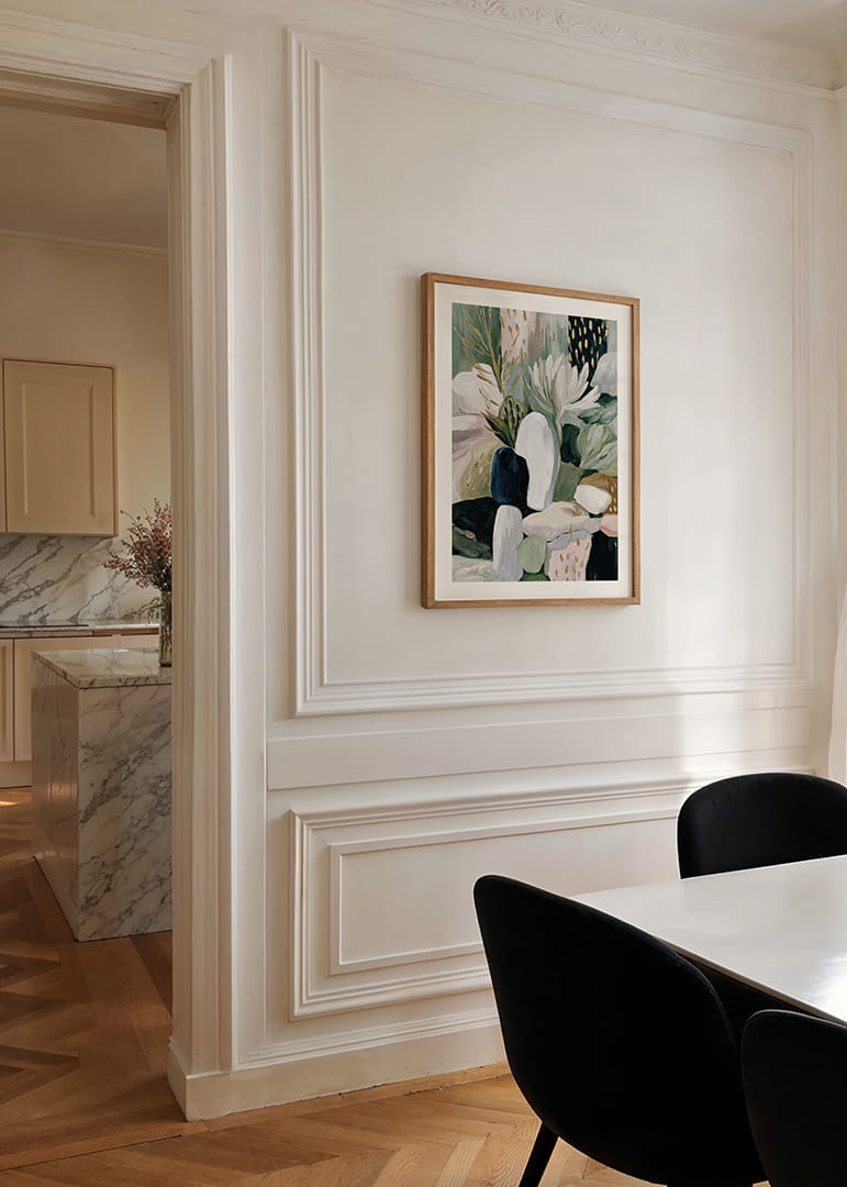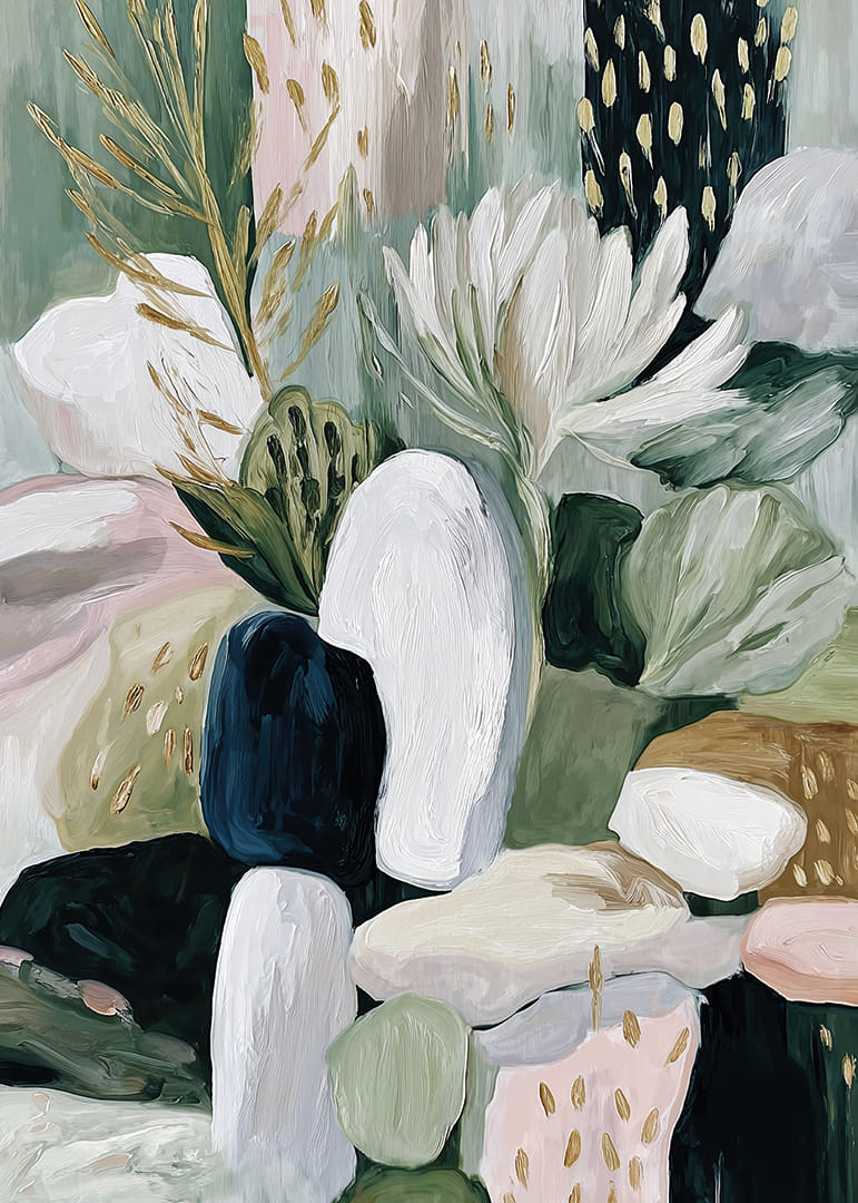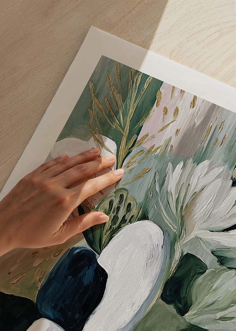 Denna poster fångar ögonen med sitt abstrakta uttryck av blommor och blad, där mjuka toner av grönt, vitt och jordfärger vävs samman. De harmoniska linjerna och formerna skapar en känsla av ro och balans. Blommorna tycks nästan sväva, vilket ger en luftig lätthet. En sådan poster kan förvandla vilket rum som helst till en oas av lugn och skönhet, perfekt för att höja stämningen.