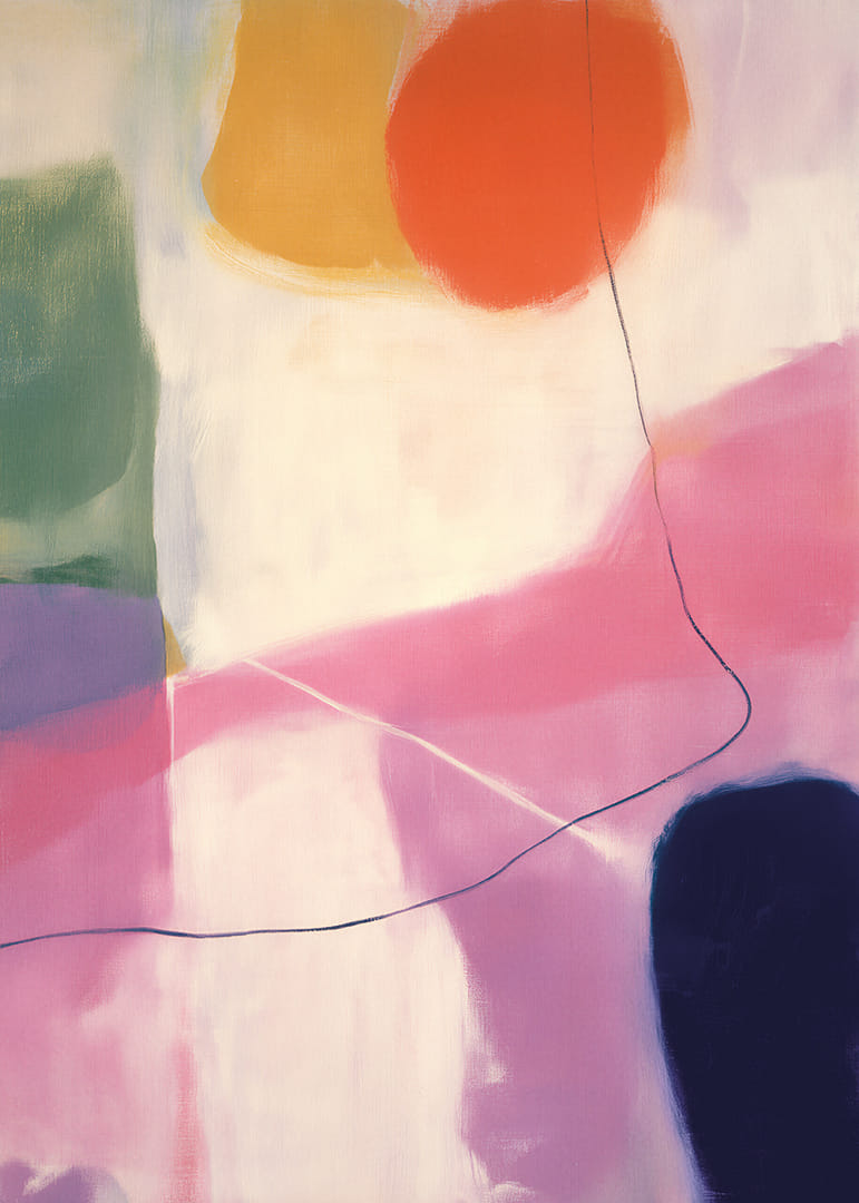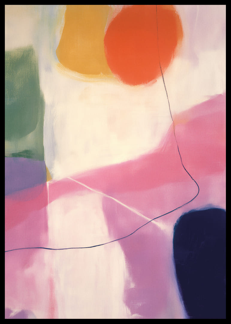 Denna poster erbjuder en levande symfoni av färger som smälter samman i en abstrakt harmoni. De ljusa rosa, djärva orange och djupa blå nyanserna skapar en dynamisk känsla av rörelse och energi. Den mjuka övergången av färger ger en lugnande men samtidigt upplyftande atmosfär. Perfekt för att ge liv och färg till varje rum, denna poster blir en iögonfallande mittpunkt i ditt hem.