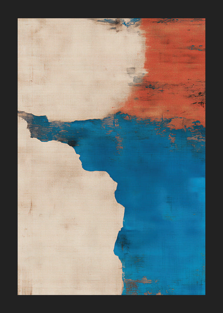 Denna poster fångar uppmärksamheten direkt med sina djärva toner av blått och rött. De kontrasterande färgerna skapar en harmonisk balans som för tankarna till en drömsk kustlinje. Texturen och de mjuka övergångarna ger bilden en atmosfär av rustik elegans. Denna poster blir ett perfekt fokus i vardagsrummet, där den bidrar med färg och karaktär som både lugnar och inspirerar.