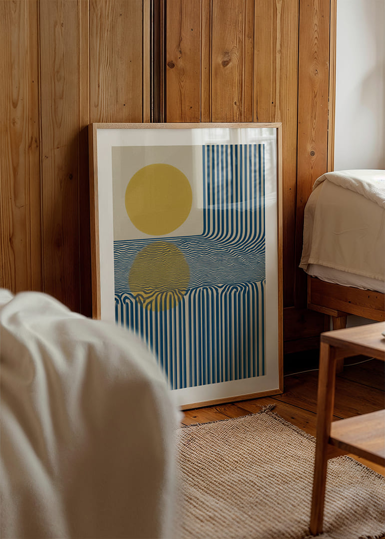Det här är en poster som fångar ögat med sina hypnotiska blå linjer och den ståtliga gyllene solen ovanför. Linjernas flöde skapar en fascinerande rörelse, som om de följer solens resa över himlen. Denna poster sprider en känsla av harmoni och balans samtidigt som den skapar en djärv visuell effekt. Perfekt för att ge ett rum en modern och sofistikerad känsla, oavsett stil och inredning.