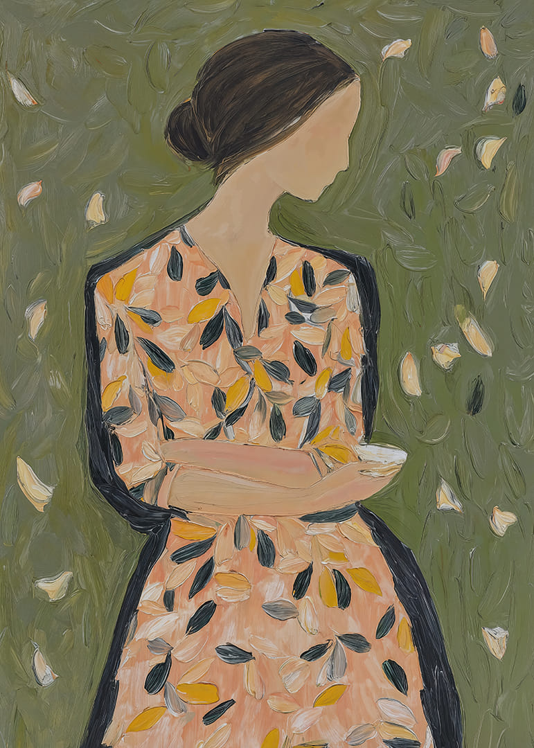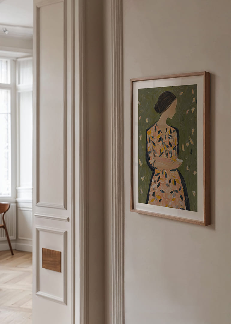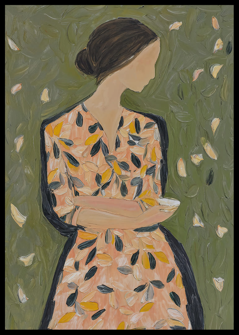 Mitt i denna poster omfamnas man av en helt egen värld där en kvinna står omgiven av mjuka höstlöv. Hennes klänning pryds av bladverk i varma nyanser som smälter samman med bakgrunden, vilket skapar en känsla av ro och subtil elegans. Det svepande penseldraget ger liv åt motivet och förstärker det drömlika intrycket. Denna poster ger en sofistikerad touch och förhöjer känslan i vilket rum den än placeras.