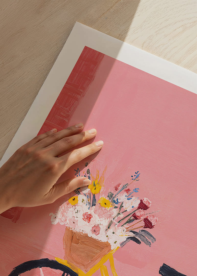 Denna poster fångar essensen av vårens glädje med en gul cykel fylld med blomsterprakt. Färgerna glöder mot den rosa bakgrunden och skapar en fridfull atmosfär. Blommorna i cykelkorgen representerar liv och uppvaknande, vilket ger energi och vitalitet till rummet. Postern blir en ljuspunkt i varje hem, perfekt för att förnya och fräscha upp ditt vardagsrum med en touch av naturens skönhet.