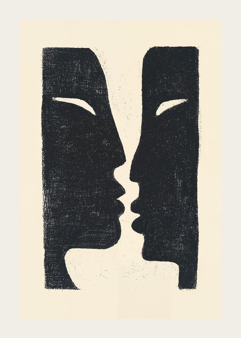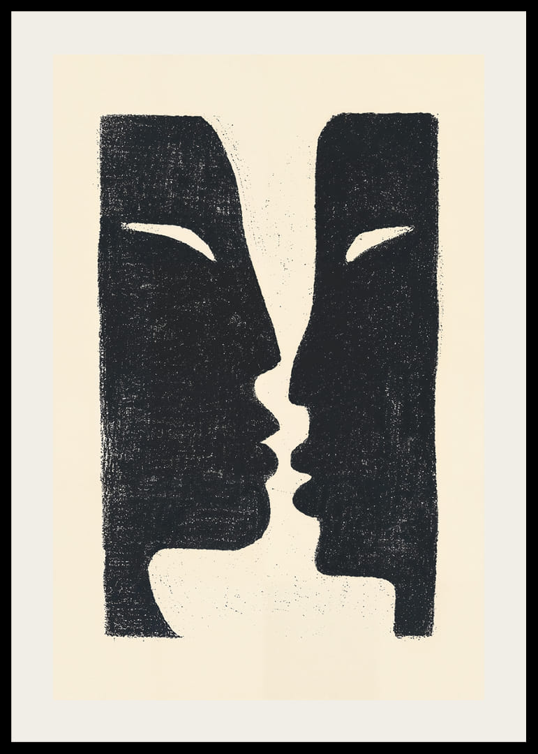 Denna poster fångar omedelbart blicken med två ansikten i silhuett som möts i en tyst dialog. Den starka kontrasten mellan det svarta och vita ger en dramatisk känsla av mystik och intimitet. Posterns minimalistiska design skapar ett tidlöst uttryck, vilket gör den till ett perfekt komplement i ett modernt hem där den erbjuder en kombination av konstnärlig skönhet och djup tankeväckande känsla.