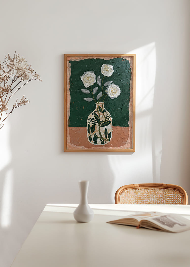 Denna poster fångar tidlös elegans med tre stiliserade vita rosor i en vas mot en djupgrön bakgrund. Texturen i både blommor och bakgrund skapar en känsla av rörelse och kontrast. Den harmoniska kompositionen av neutrala och jordnära toner ger en känsla av lugn och balans. Perfekt för att förhöja atmosfären i vilket rum som helst och ge en hint av sofistikation och naturinspirerad skönhet.