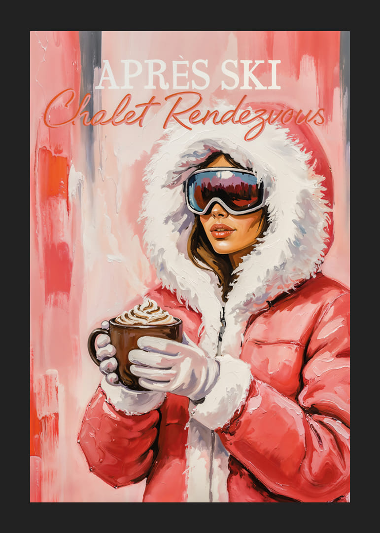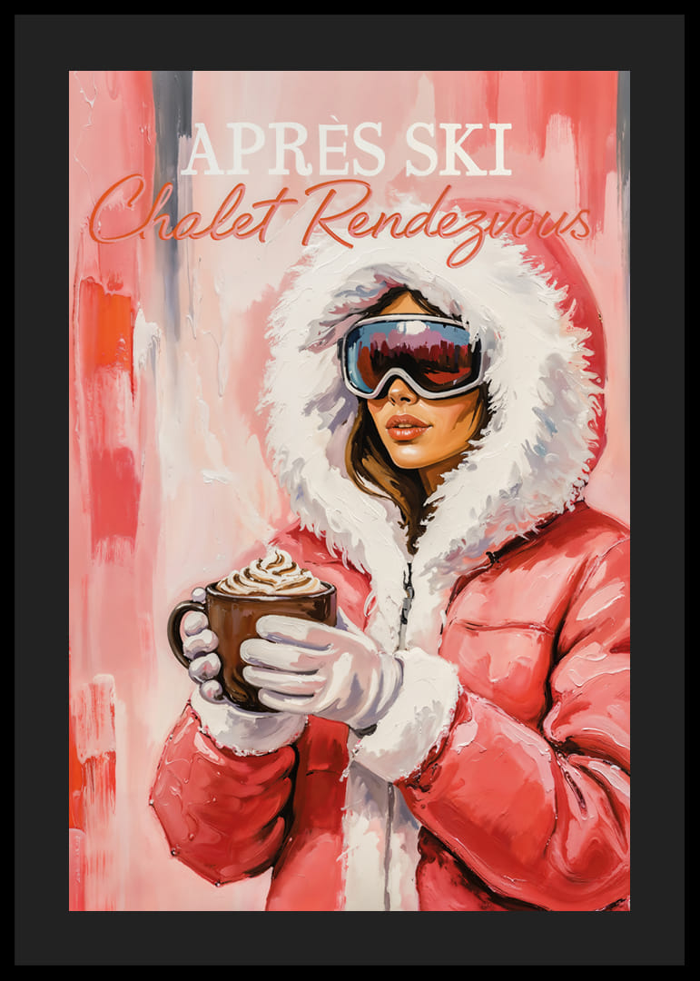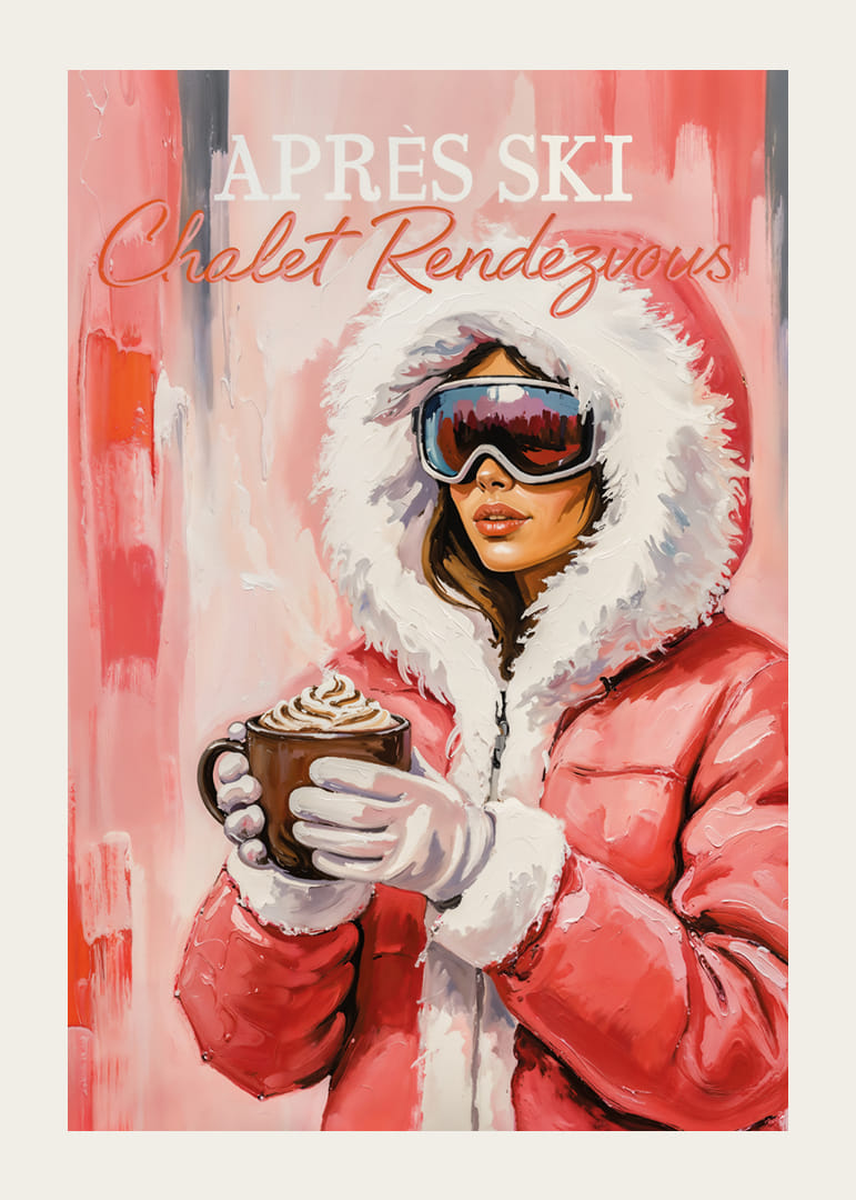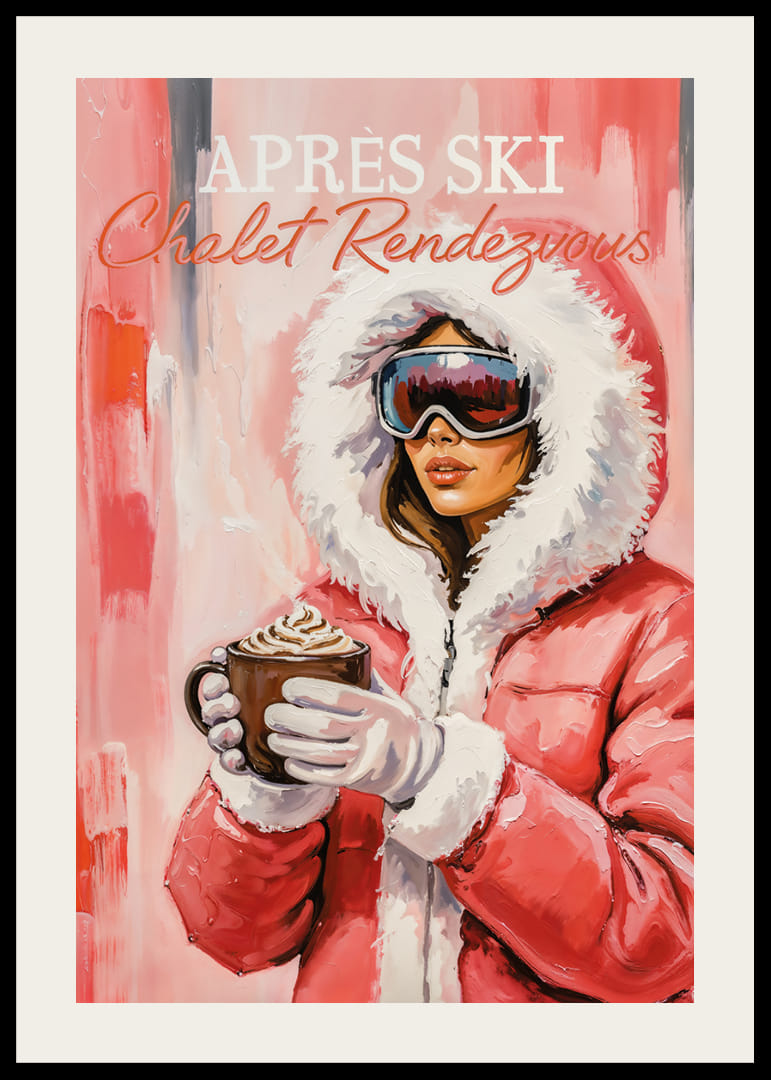 Denna poster fångar skönheten i en gnistrande vintervärld. Med en kvinna klädd i en lyxig röd vinterjacka och stora solglasögon, omsluten av snö och med en varm choklad i händerna, utstrålar den en känsla av varm komfort och elegans. Detta konstverk tillför en känsla av mysig alpin atmosfär och sofistikation till vilket rum som helst, perfekt för att skapa vinterkänsla.