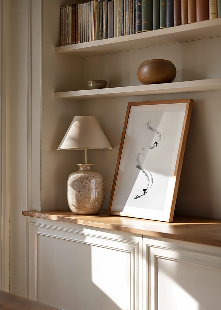 Denna poster fångar essensen av vinterns frihet med två skidåkare som elegant sveper nerför en opistad backe, vilket skapar perfekta kurvor i snön. Den rena, vita ytan och skidåkarnas samstämmiga rörelser ger en känsla av balans och harmoni. Denna poster är perfekt för att ge rummet en känsla av rörelse och frihet, där snöns tystnad möter människans äventyrslystnad.