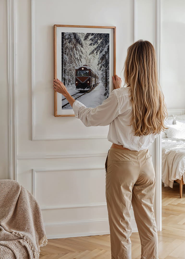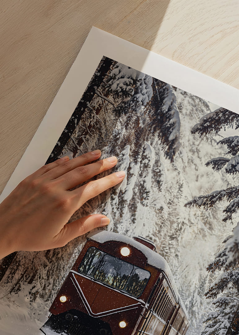 En poster med ett majestätiskt tåg som skär genom det snötäckta landskapet fångar vinterns mystik och äventyrslust. De snötyngda träden omfamnar rälsen, medan det röda tåget bryter tystnaden med sin eleganta styrka. Denna poster förvandlar vilket rum som helst till en portal av vinterfantasi, ger rummet en känsla av rörelse och stillhet, där naturens skönhet står i centrum.