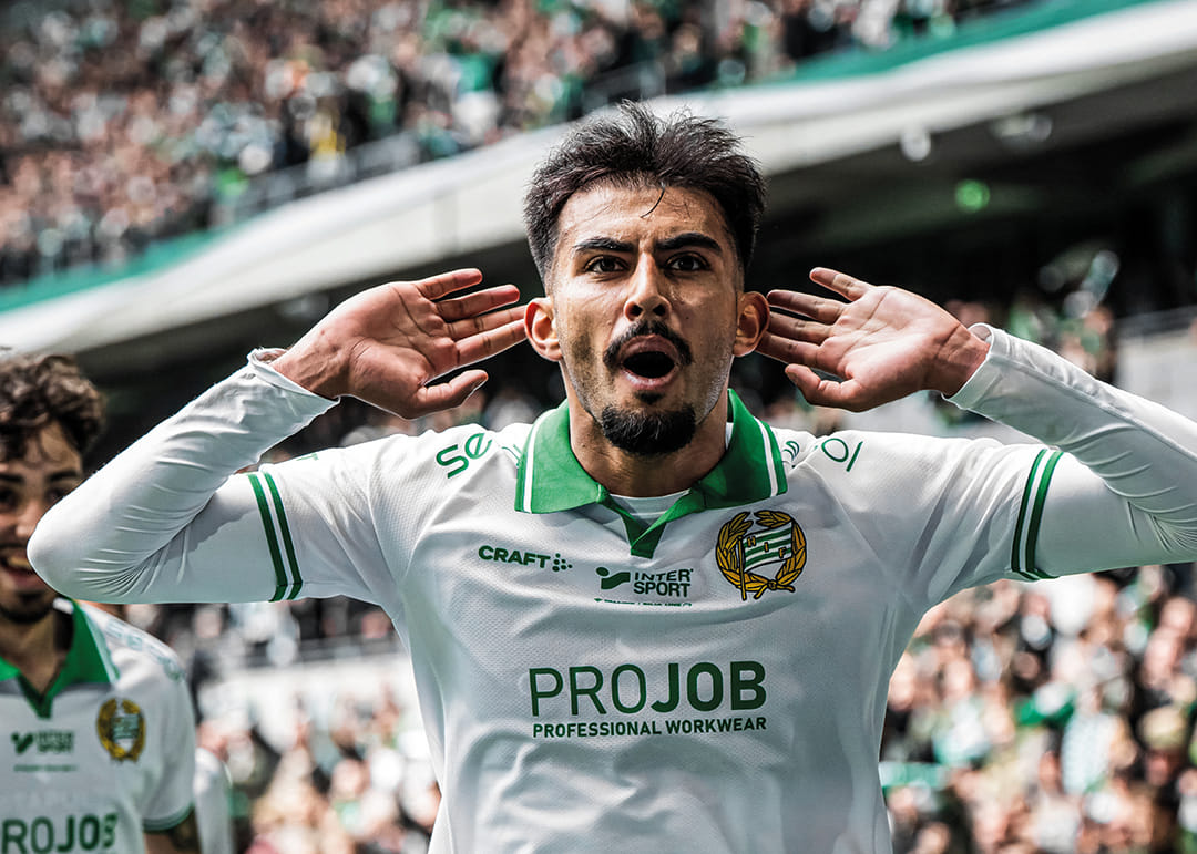 Hammarbys Montader Madjed jublar efter 1-1 under fotbollsmatchen i Allsvenskan mellan Hammarby och IFK Norrköping den 11 maj 2025 i Stockholm.